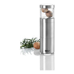 Die Muskatmühle Muskatino aus Edelstahl/Acryl mit einem Durchmesser von 3,8 cm und einer von Höhe 12,5 cm.