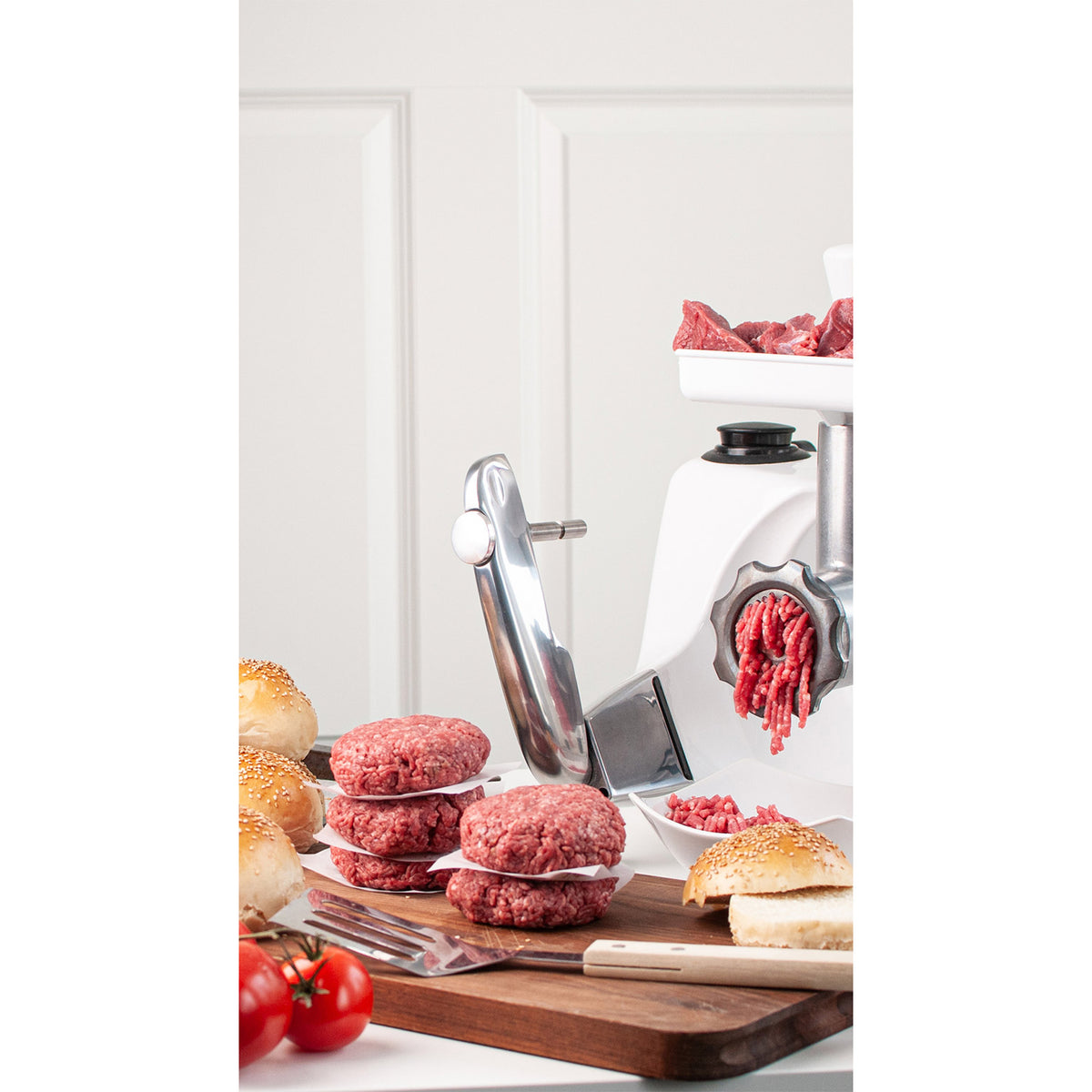 Zusätzlich zum Fleischwolf mit 4,5 mm Lochscheibe, Einfüllschale und Stopfer, der Ihnen beim Zerhacken hilft, haben Sie alles, was Sie brauchen, um Ihre eigene Wurst zu machen! Sie erhalten drei verschiedene Tüllen zum Wurststopfen, so dass Sie alles, von Hot Dogs und Nürnbergern bis zu Bratwürsten und Salsiccia machen können – oder wie wäre es mit einer Fischwurst-