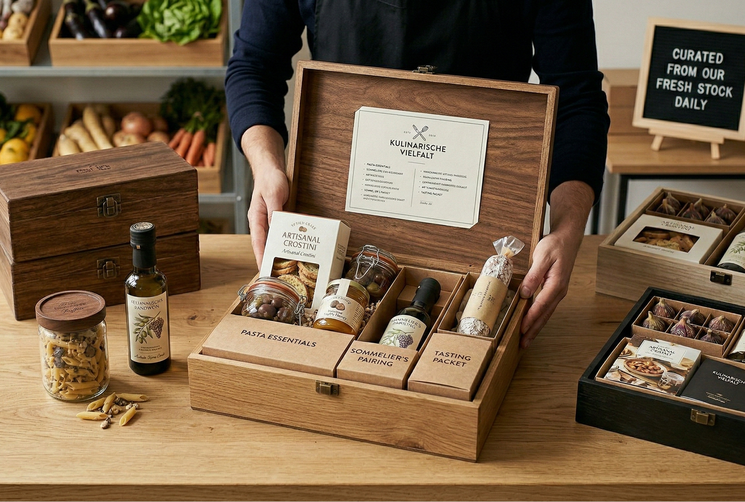 Von der klassischen Pasta Box bis hin zum umfangreichen Degustations-Paket: unsere Auswahl an Feinkostpräsenten bietet für jeden Gaumen das Richtige. Da wir unsere Pakete direkt aus unserem aktuellen Bestand zusammenstellen, garantieren wir Frische und eine exzellente Auswahl an hochwertigen Produkten. Entdecke die moderne Art des Schenkens: ehrlich, geschmackvoll und ohne unnötigen Ballast.