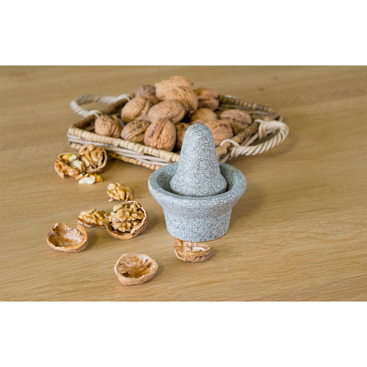 Der Denk-Handmörser kommt nicht nur bei Gewürzen zum Einsatz, er kann noch mehr. Legen Sie eine Nuss hinein und ein beherzter Schlag mit dem Pistill genügt und schon ist die Schale geknackt. Dabei bleiben die Schalenreste im Mörser und fliegen Ihnen nicht um die Ohren. Eine saubere und unkomplizierte Art auch härteste Nüsse zu knacken.