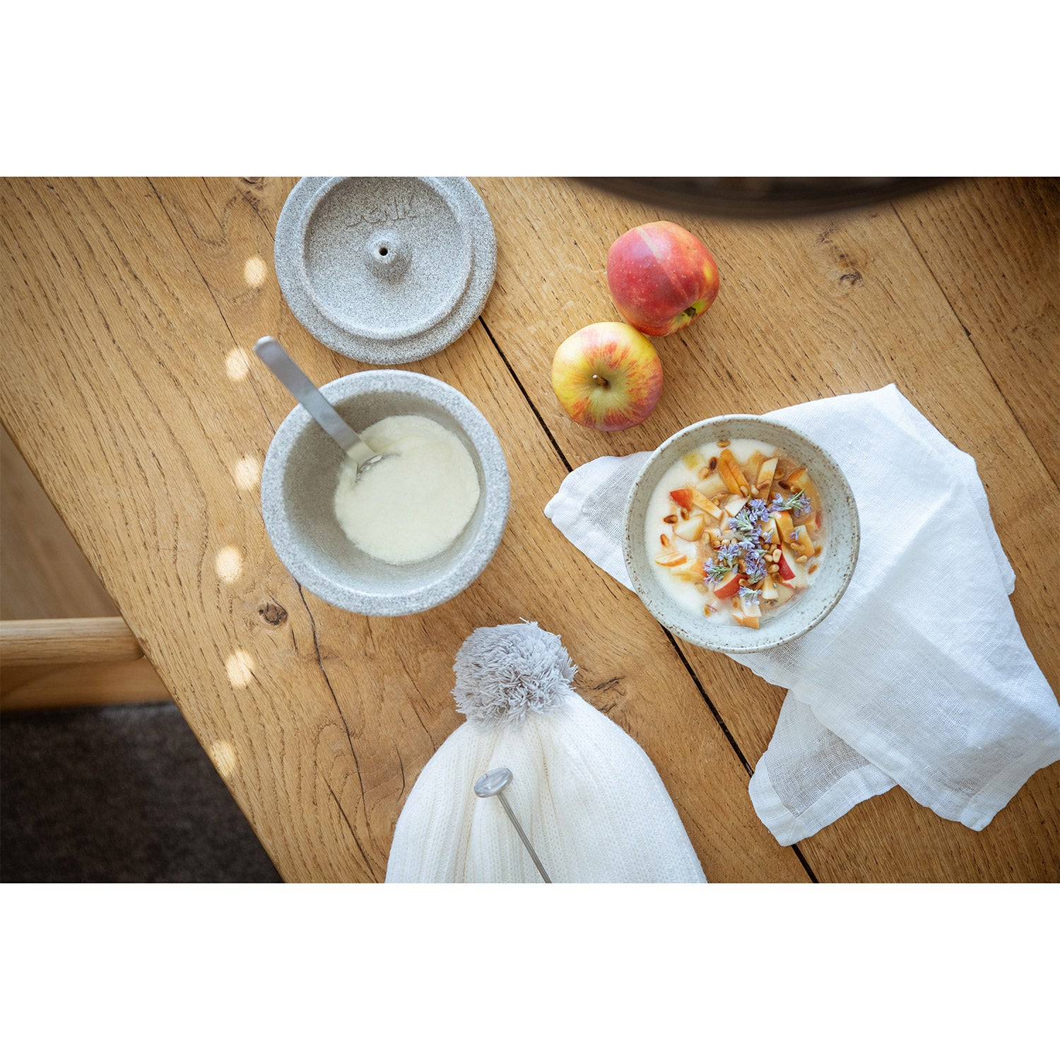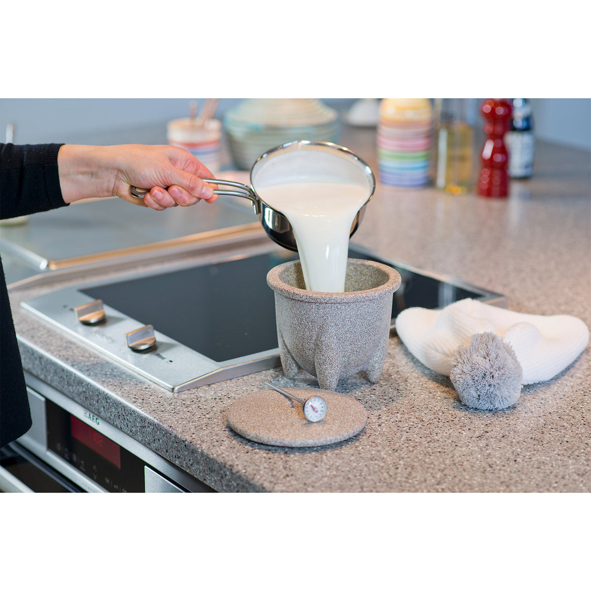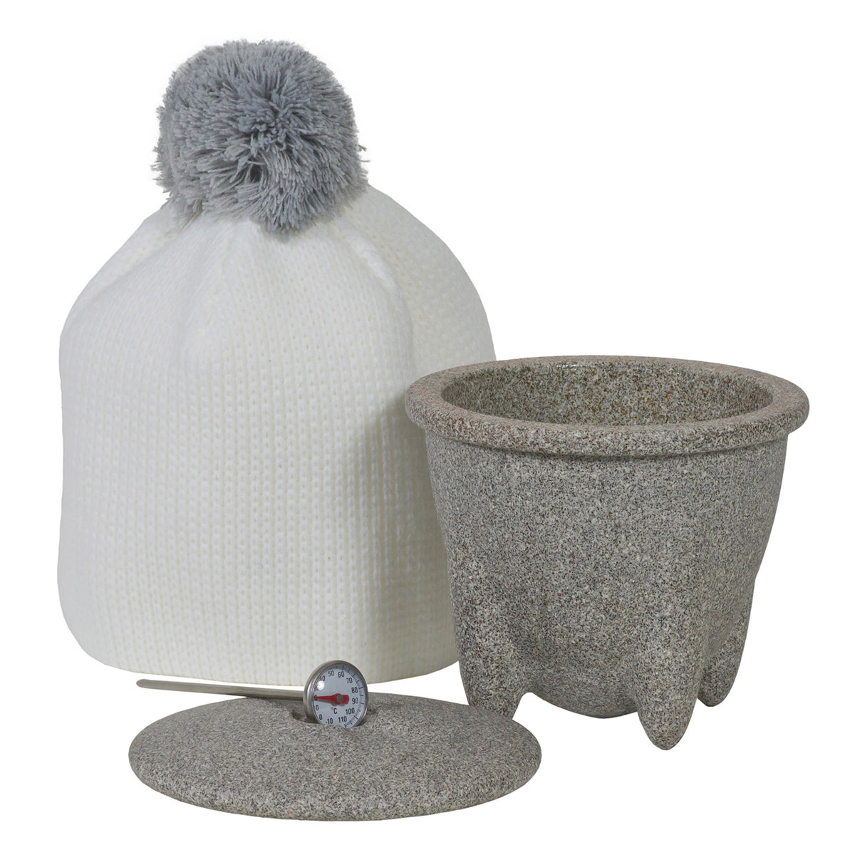 Joghurtmacher Schale und Deckel Granicium, Thermometer, gestrickte Wärmemütze, Anleitung