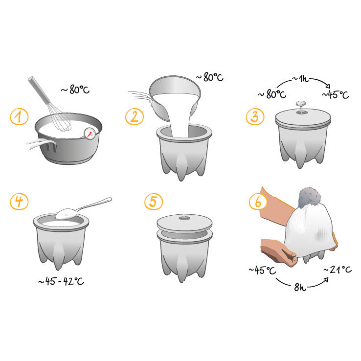 - Bei Raumtemperatur (ca. 20°–22°C) kühlt nun die Milch innerhalb von ca. 1 Std. auf 45°– 42°C ab.
