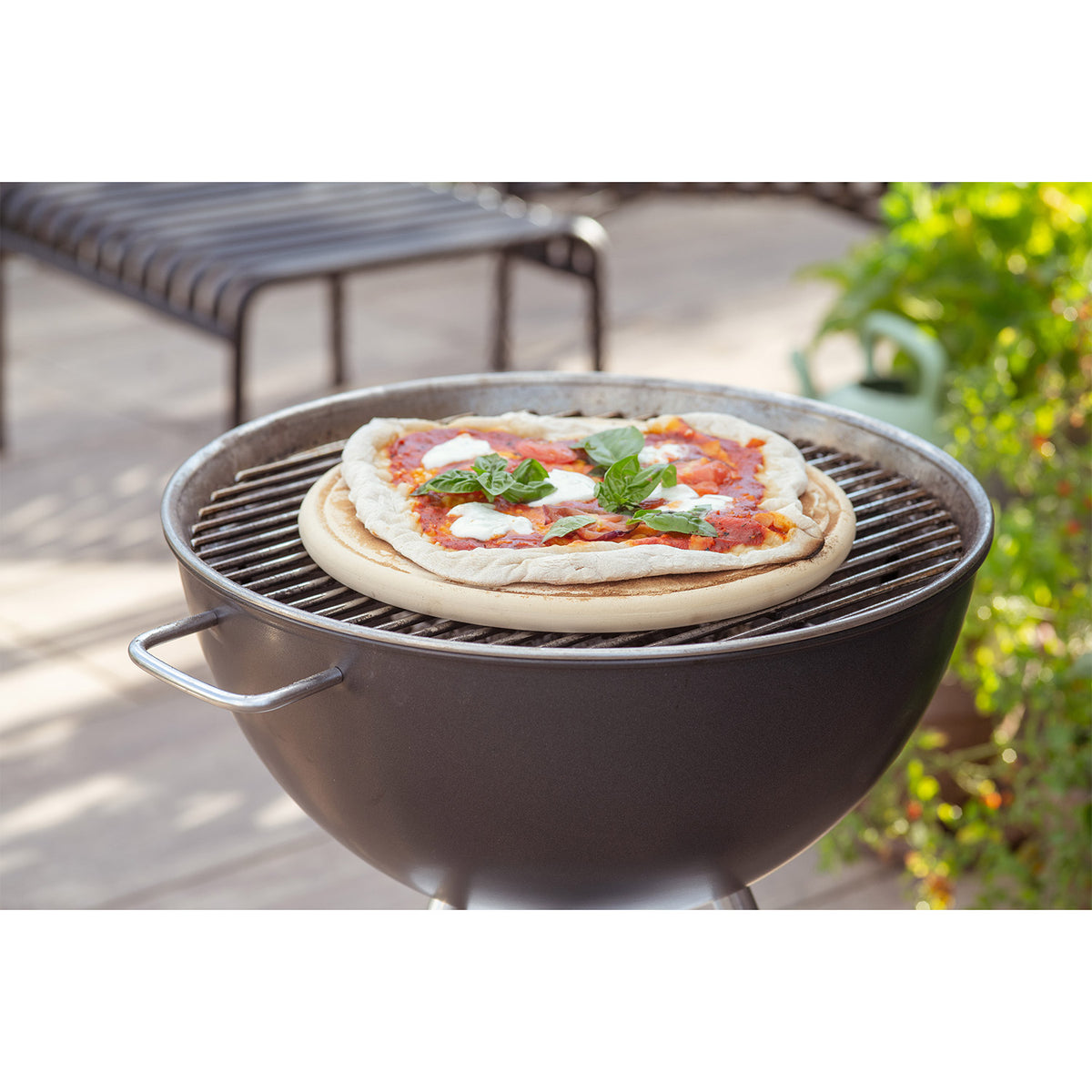 Mit der Denk Pizzaplatte kann man auch in einem Kugelgrill perfekte Pizza backen. Mit wenigen Handgriffen können Sie zur nächsten Gartenparty original italienische Pizza servieren.