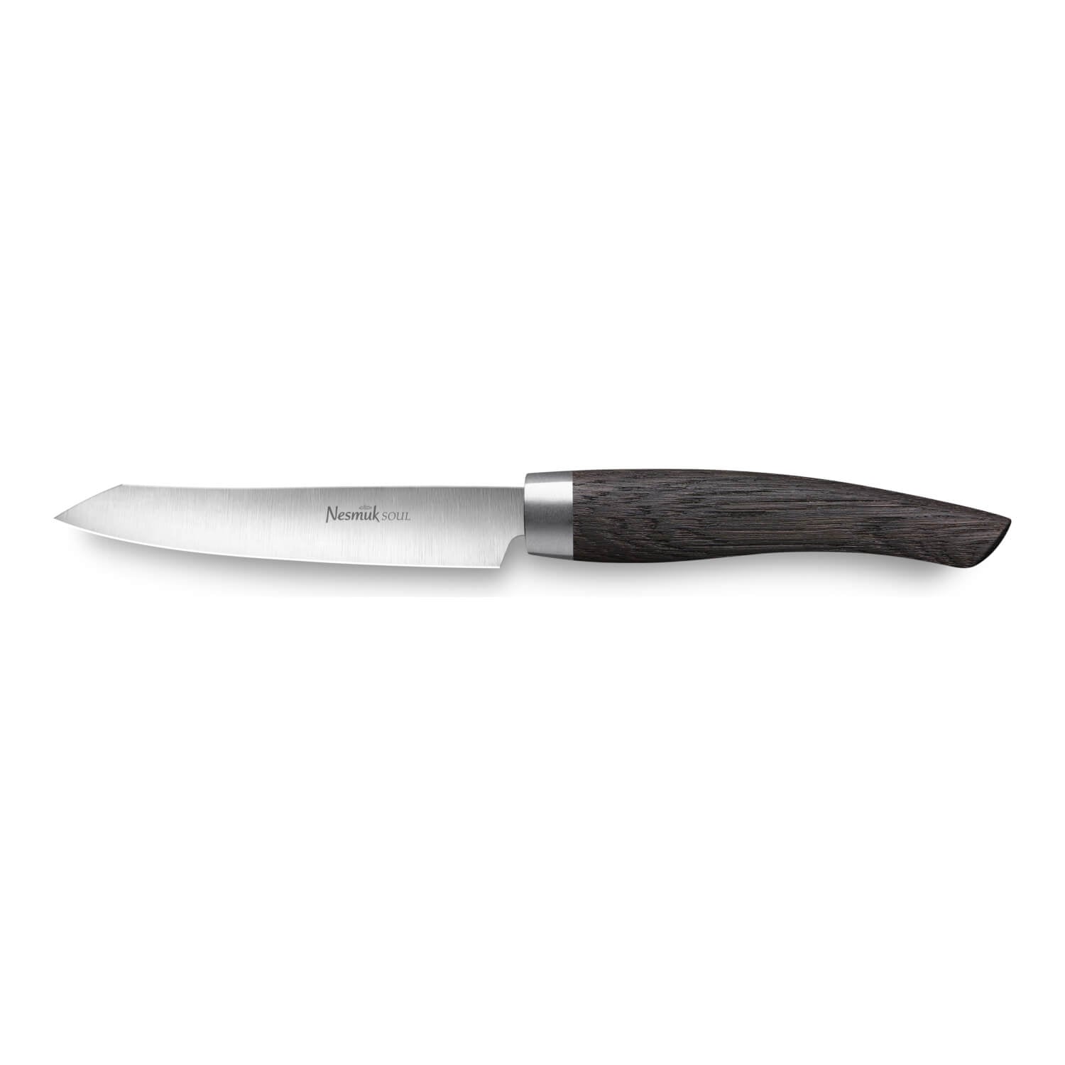 Im Klingendesign, in der herausragenden Schneidleistung, in der Ausgewogenheit zwischen Schärfe und Standzeit, spiegelt sich die „Seele“ dieses Messertyps optimal wider. Die Besonderheit der Kollektion SOUL ist die einzigartige Legierung des Klingenstahls: Der patentierte Nesmuk Stahl enthält das seltene Element Niob – dieses sorgt für das feinst-mögliche Stahlgefüge trotz Rostträgheit. Gleichzeitig wird eine höhere mechanische Festigkeit erreicht, die Klinge wird fester und zäher. Die geprüfte Stahlhärte liegt bei 60 HRC. Das Ergebnis ist eine erhöhte Standzeit und Schnitthaltigkeit. Zwar wird die Verarbeitung des Stahls durch dessen Zähigkeit erschwert, aber durch die Kombination des feinen Stahlgefüges, der ungewöhnlich dünn geschliffenen Klingen und der handwerklichen Präzision der Manufaktur wird die extreme Schärfe erreicht, die Nesmuk von herkömmlichen Messern unterscheidet.