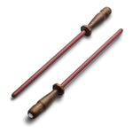Der Nesmuk Schärfstab ist das passende Werkzeug, um stumpfe Messer schnell und effektiv nachzuschärfen. Da jedes Messer, abhängig von der Güte des Stahls früher oder später stumpf wird, muss es irgendwann geschärft werden. Die Schärfe von Nesmuk Messern kann man sehr lange mithilfe des Nesmuk Streichriemens erhalten und pflegen. Durch Hartkontakte, seitliches Schieben über Schneidunterlagen oder zu lange Pflegeintervalle können jedoch auch die widerstandsfähigsten Klingen so stumpfen, dass man etwas mehr Material von der Schneide abtragen muss, um die Klinge wieder scharf zu bekommen. Genau für diesen Zweck haben wir den Nesmuk Schärfstab entwickelt. Herkömmliche Wetzstäbe besitzen in den meisten Fällen relativ grobe Schleifkörper, die die Oberfläche der Schneide beim Schärfen zu sehr aufrauen.
