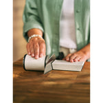 Sollte die Schneide bei besonders hohen Klingen über dem Radius des Rollschleifers liegen, empfiehlt es sich, sie mit einem entsprechenden Gegenstand wie z.B. einem Schneidebrett oder einem Buch zu unterlegen. Dadurch wird sichergestellt, dass die Schneide ausreichend gut auf der Diamantschleifscheibe aufliegt.