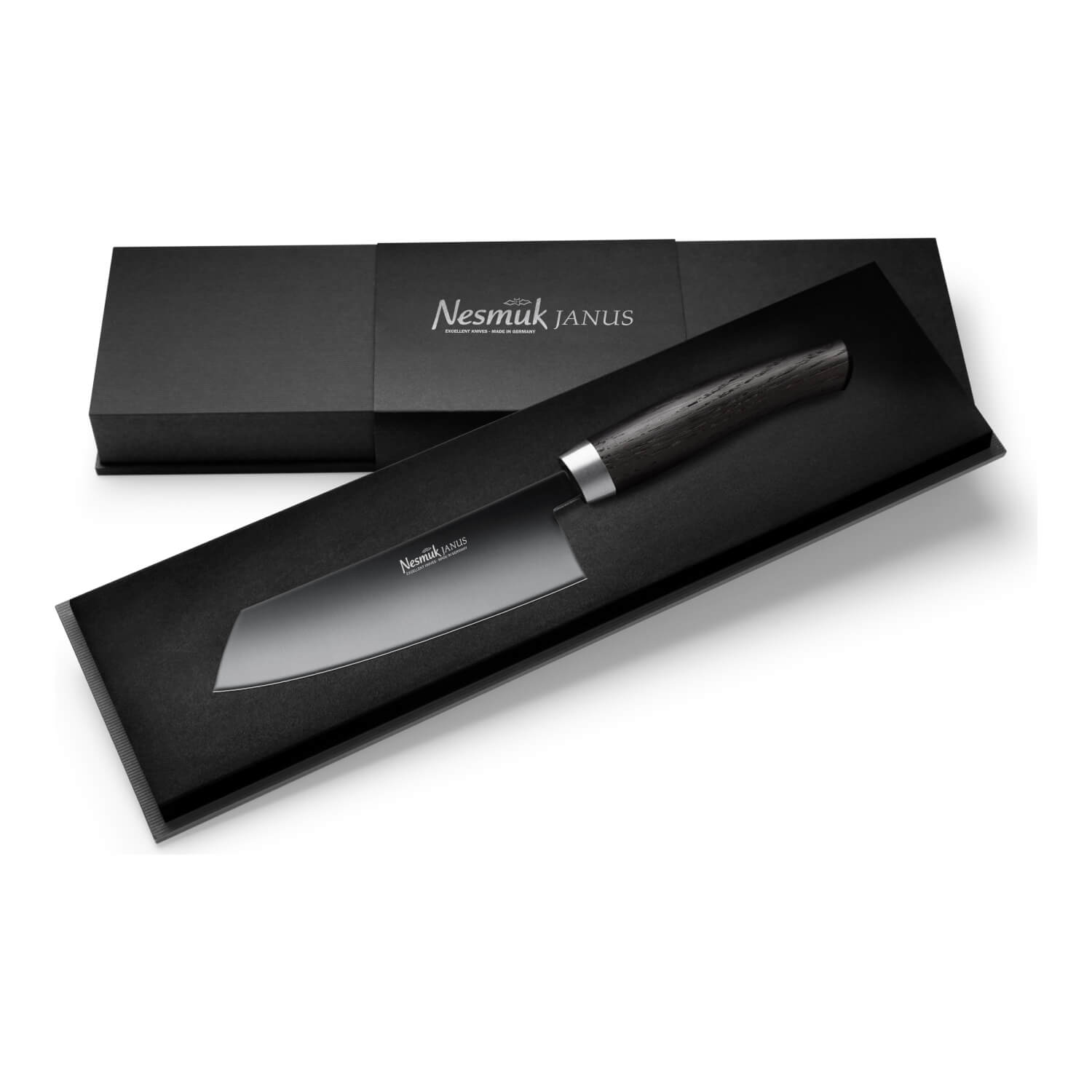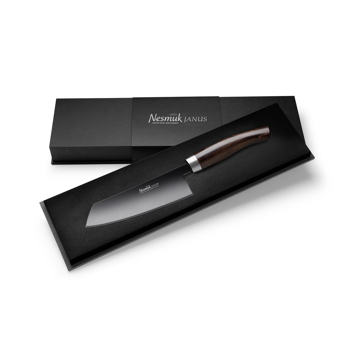 Nesmuk JANUS mit Griff Karelische Maserbirke – unverkennbar an der schwarzen Klinge – wird aus einem Hochleistungsstahl mit Niobanteil gefertigt und mit einer hochwertigen Diamond-like-carbon Beschichtung (DLC) veredelt, die die funktionalen Eigenschaften der Klinge optimiert. Das Kochmesser mit einer 140 mm langen und 4 mm starken, einseitig hohlgeschliffenen Klinge ist der Allrounder, mit dem man rund 80 % aller Schneidaufgaben erledigen kann. Als „Basis-Messer“ in jeder Küche unverzichtbar und vielseitig einsetzbar.