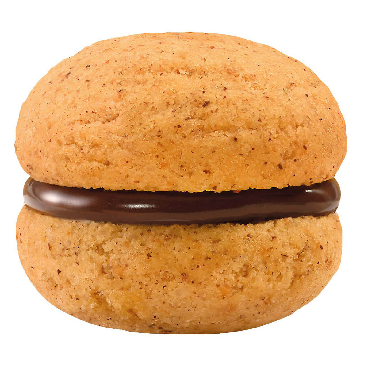 Zwei mürbe Kekshälften aus geröstetem Haselnussmehl, hauchzart gebacken, umschließen eine feinherbe Schokoladencreme. Ein perfekter Kontrast zwischen nussiger Tiefe und schokoladiger Verführung. Die edlen Zutaten stammen aus biologischem Anbau und sorgen für ein reines, unverfälschtes Geschmackserlebnis.
