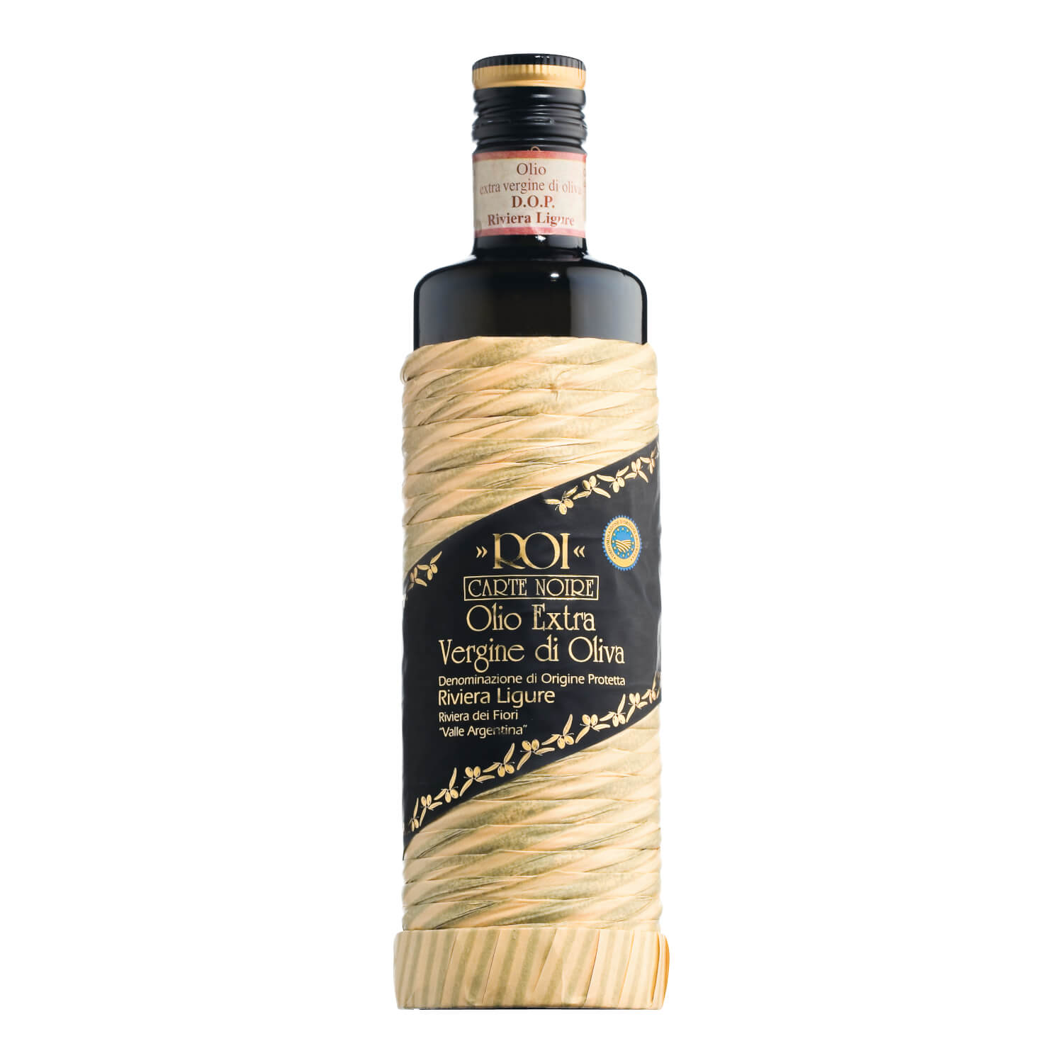 Das ausgezeichnete Olivenöl Olio Roi Carte Noire DOP Riviera dei Fiori wird ausschließlich aus DOP Taggiasca Oliven gewonnen, die auf den historischen Terrassen des Valle Argentina wachsen. Dort ist die Wiege der Sorte Taggiasca. Der Name Carte Noire bezeichnete bislang ein Tropföl, das in einer alten Steinmühle erzeugt wurde. Jetzt werden die Oliven in einer hochmodernen Mühle unter Luftverschluss von Granitsteinen gemahlen. Das Öl mit einer nussigen, grünen Note ist jetzt noch fruchtiger. Es ist limitiert und jede Flasche ist nummeriert.