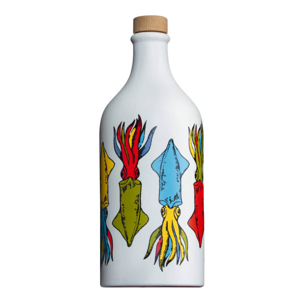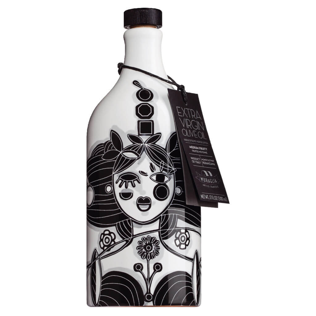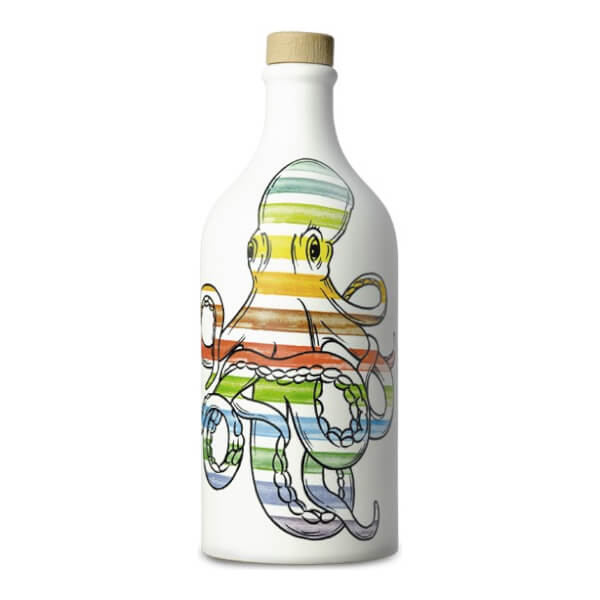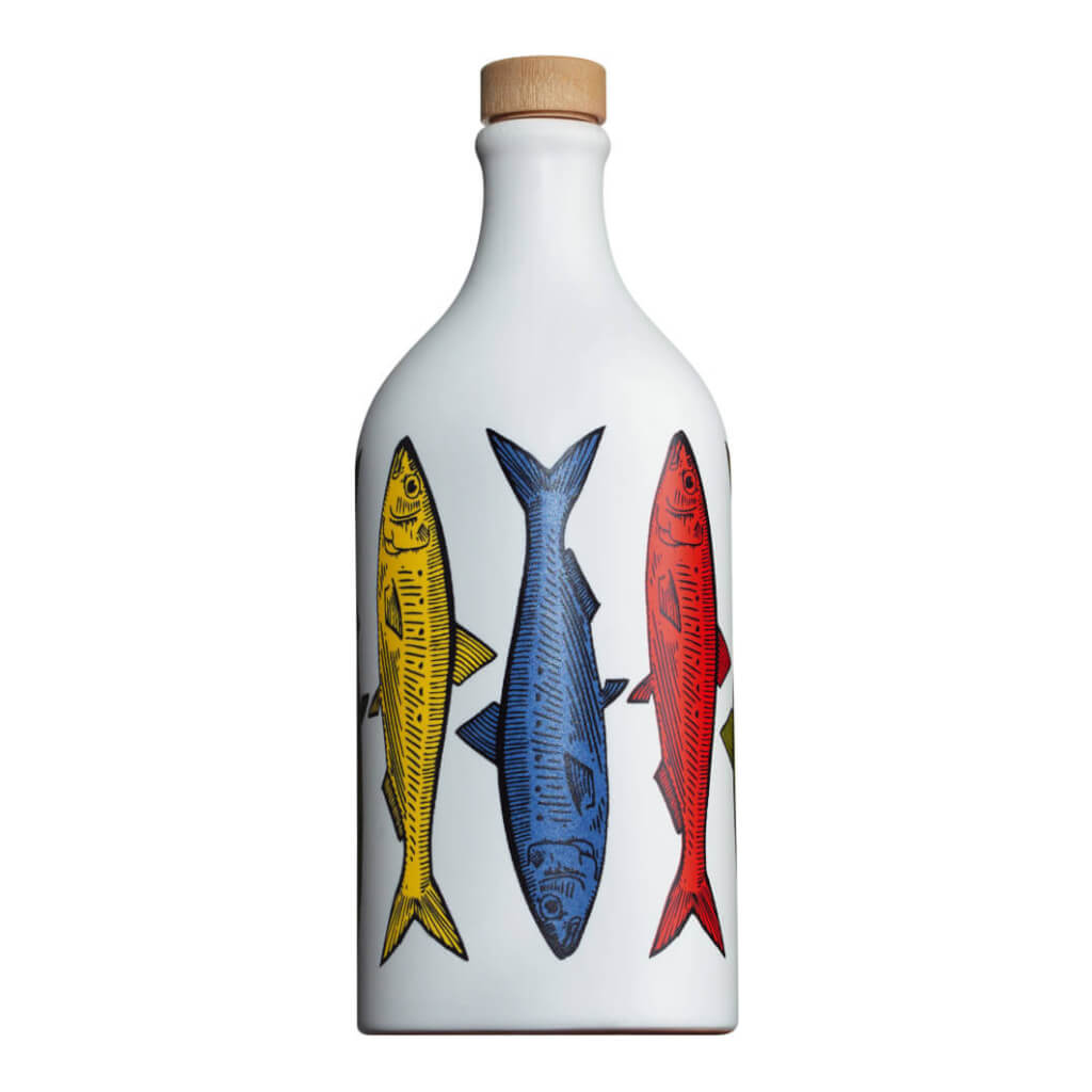 Apulien grüßt farbenfroh mit Sardinen. Die handgetöpferten und bemalten Olivenölflaschen sind angelehnt an die jahrhundertealte Terracotta-Tradition der Region. Jedes Jahr erneut füllt Familie Muraglia, seit über 80 Jahren Olivenbauern, besonders gutes Olivenöl nativ extra in die leuchtenden, dekorativen Flaschen. Das reinsortige Öl aus der Peranzana-Olive besitzt eine elegante Feinfruchtigkeit.