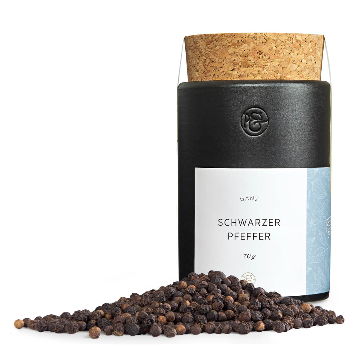 Produktinfos für Schwarzer Tellicherry Pfeffer ganz von Pfeffersack & Söhne, 80 g, Keramikdose