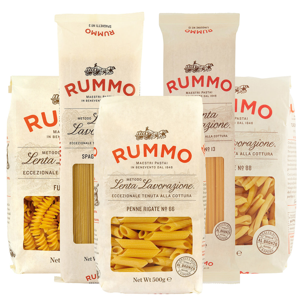 Das Probierpaket beinhaltet folgende Pastasorten: Rummo Spaghetti N° 3, Rummo Fusilli N° 48, Rummo Linguine N° 13, Rummo Penne Rigate N° 66 und Rummo Casarecce N° 88 - jede Sorte mit einer Packungsgröße von 500 g. Diese Hartweizennudeln zeichnen sich durch ihre einzigartige Qualität aus. Durch das Ziehen der Nudeln durch Bronzescheiben erhalten sie ihre charakteristische rauhe Oberfläche, die Saucen besonders gut aufnimmt. Zudem werden sie langsam und schonend getrocknet, was ihnen einen breiten Garpunkt verleiht.