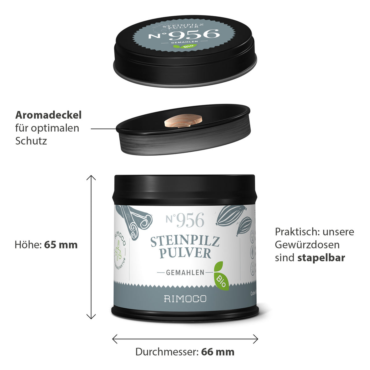 Das Bio Steinpilzpulver von Rimoco ist eine richtige Aroma-Bombe. Das merkst du bereits, wenn du die Dose zum ersten Mal öffnest und dir der kräftige, nussige und leicht salzige Duft entgegenweht. Wetten, dass dir da sofort das Wasser im Mund zusammenläuft- Wart’s ab: Dir werden unzählige Bilder von cremigen Pilzsuppen und deftigen Wildgerichten vorm inneren Auge vorbeiziehen! Doch wie funktioniert das mit dem intensiven Aroma eigentlich- Ganz einfach: Frische Steinpilze besitzen einen Wassergehalt von 90 %. Du kannst also eine gute Handvoll Pilze mit nur einer Prise des Pulvers ersetzen. Durch den Wasserentzug verdichtet sich nämlich der Geschmack. Die getrocknete Variante enthält also ein wesentlich intensiveres Aroma als frisch geerntete Pilze. Indem wir die getrockneten Pilze zu einem fein-samtigen Pulver zermahlen, erhöhen wir damit nicht nur die Haltbarkeit, sondern bieten dir auch die Möglichkeit, viel kleinere Mengen zum Würzen zu verwenden. So erhältst du ein sehr ergiebiges Produkt.