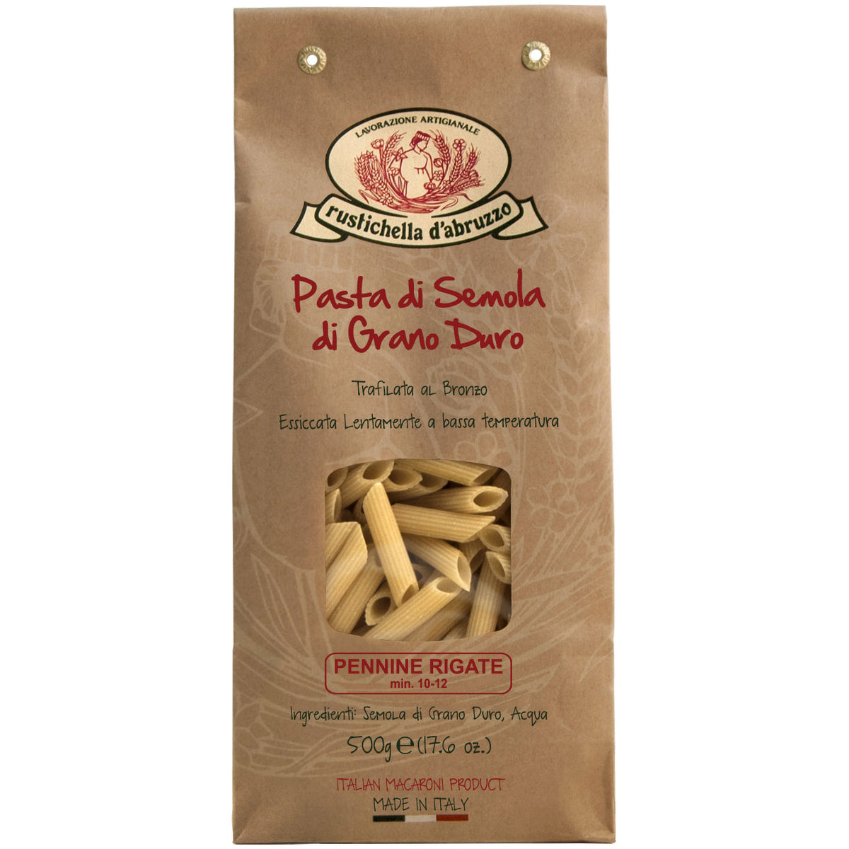 Die Pennine rigate haben einen kleineren Durchmesser als Penne Rigate. Dieses kurze Nudelformat passt sehr gut zu Zucchini und Scampi, zu Gemüse und zu einer Sauce "alla Arrabbiata" oder "alla Puttanesca" Rustichella dAbruzzo. Die Kochzeit beträgt 8-10 Minuten.