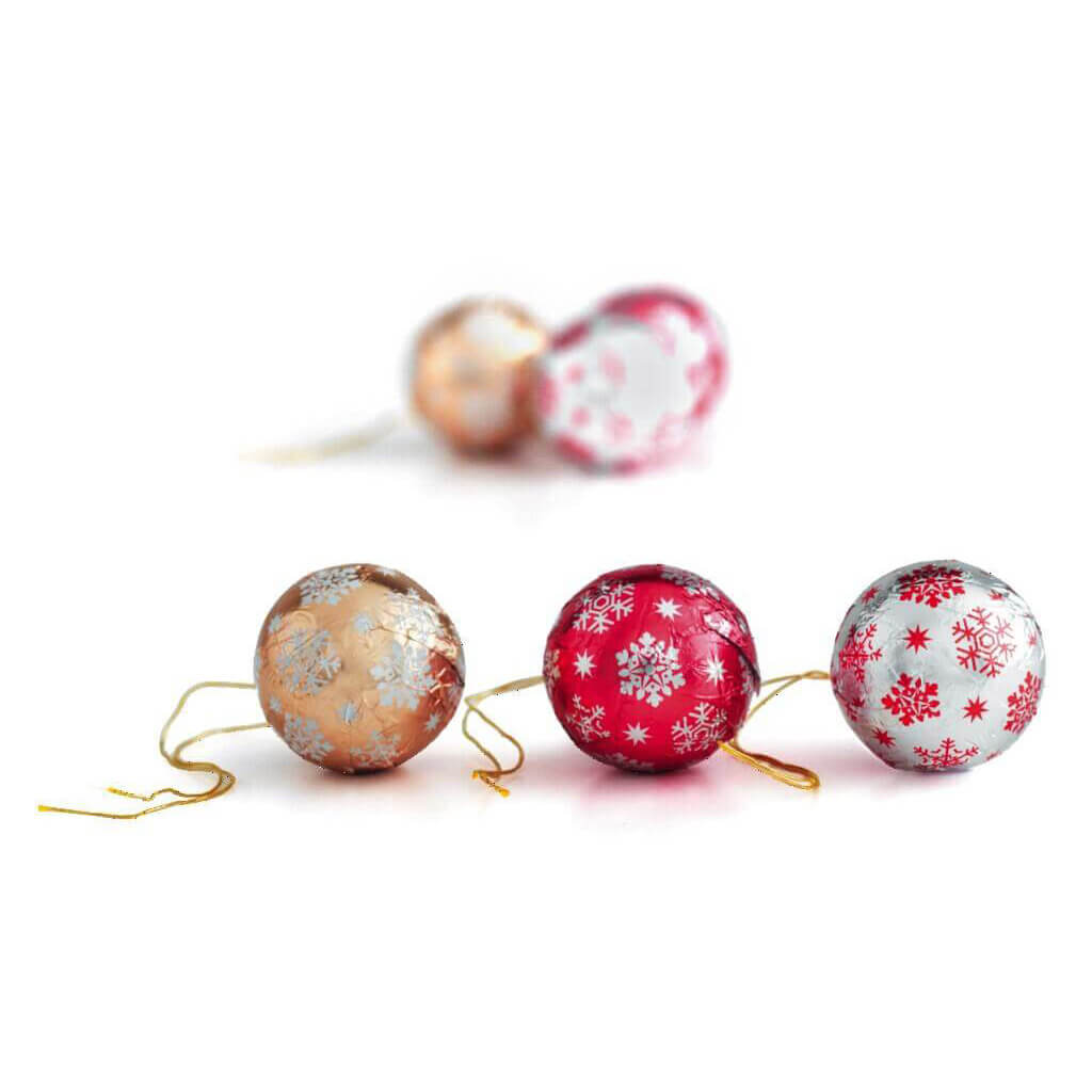 Weihnachtskugeln „Bolas Navidad“, farblich sortiert, in Gold-, Silber- und roter Folie mit Motiven von Eiskristallen. Als Baumbehang und wo immer ein weihnachtliches Flair gewünscht wird. Geliefert werden je bestelltes Set 3 Weihnachtskugeln.