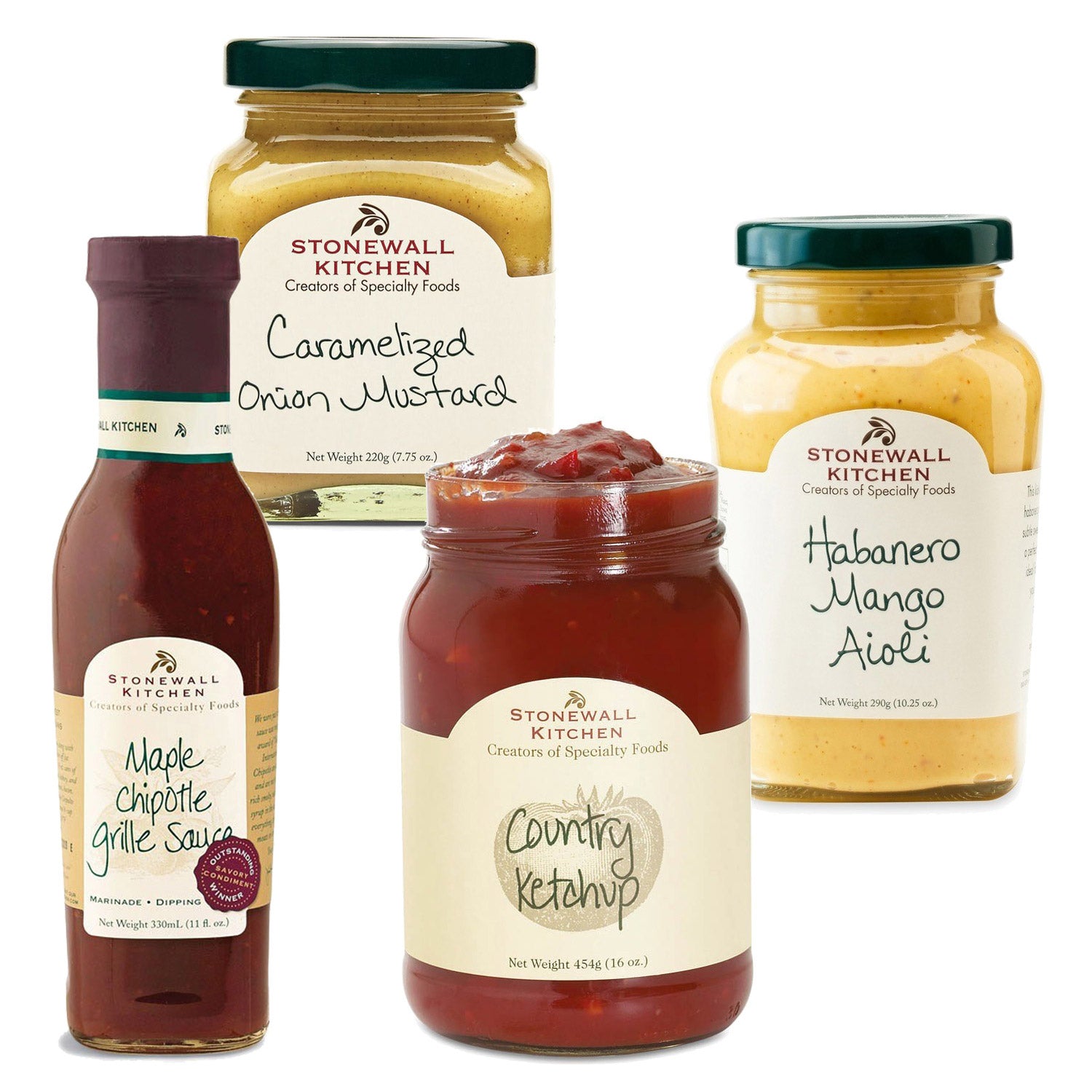 Stonewall Kitchen wurde zurecht vielfach ausgezeichnet für seine köstlichen Premium Saucen u.a. mit dem sofi-Award, der auch als Oscar der Lebensmittel gilt. Entdecken Sie die besondere Premium Qualität und den authentischen Geschmack mit diesem Kennenlernpaket.. Es beinhaltet vier der meistverkauften Artikel von Stonewall Kitchen. Probieren Sie den pikanten Dijon-Senf mit karamellisierten Zwiebeln, die preisgekrönte Maple Chipotle Grill Sauce, das fruchtig-scharfe Habanero Mango Aioli und den sehr beliebten Country Ketchup. Perfekt zum Verfeinern von Sandwiches, Barbecue-Gerichten, Pommes Frites und vielem mehr. Ein echtes kulinarisches Erlebnis aus den USA!