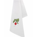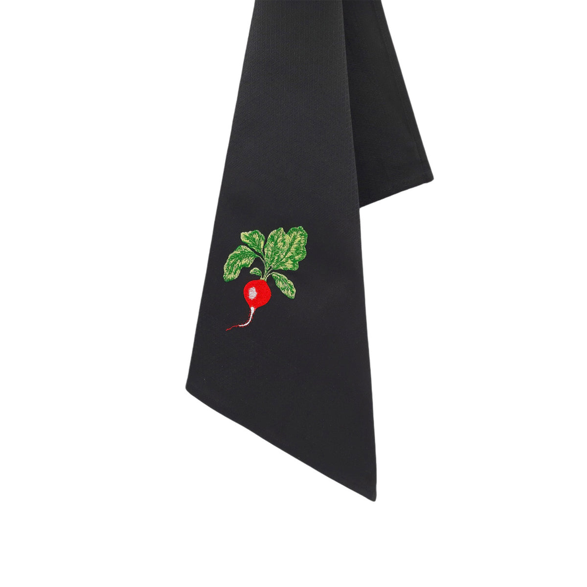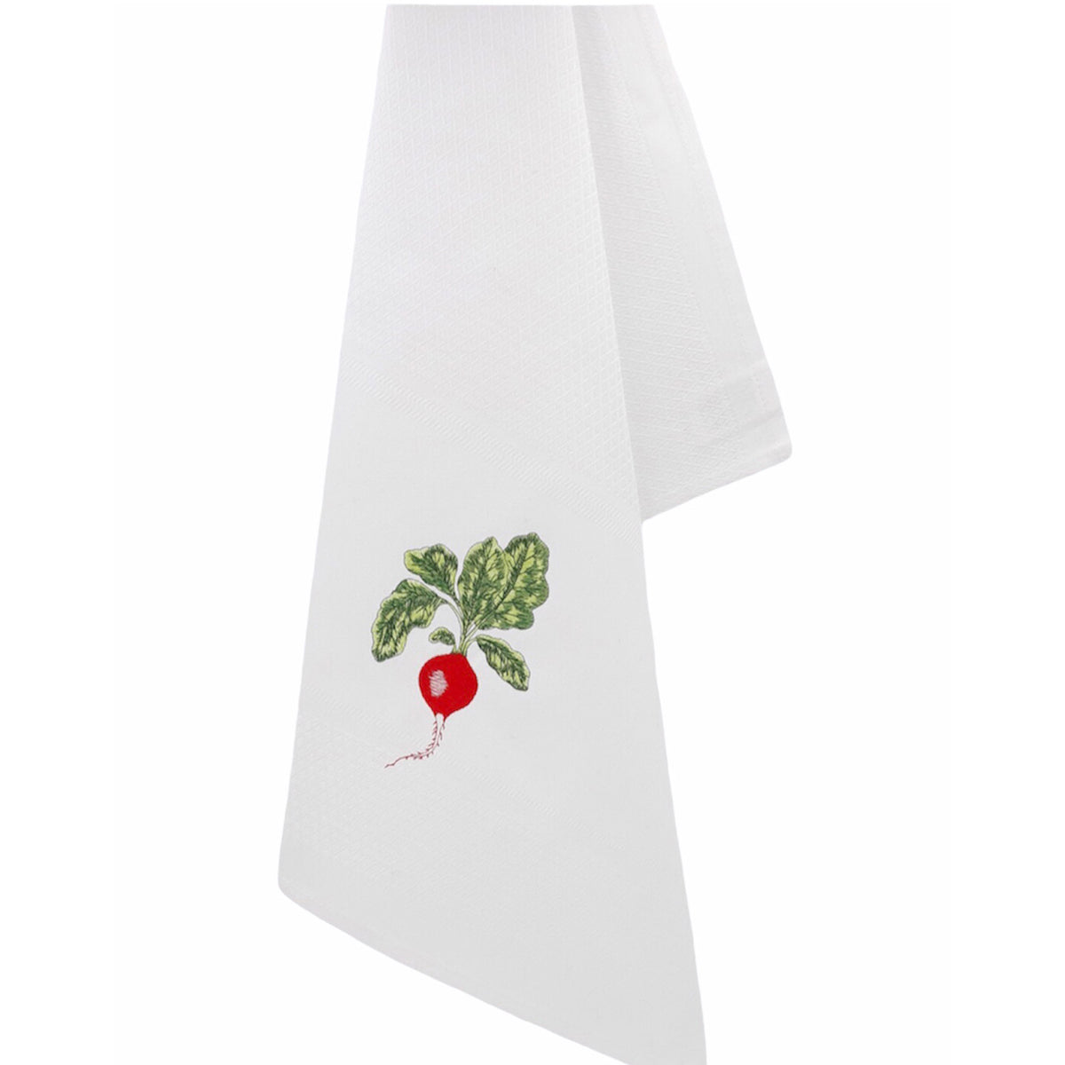 Die Küchentücher mit diamantenem Webmuster bestehen aus 100% Baumwolle-Jacquard. Sie werden in Handarbeit mit einem Motiv eines Radieschen in einem kleinen Familienbetrieb im Norden von Portugal bestickt. Sie sind außerdem Waschmaschinen- und Bügelfest
