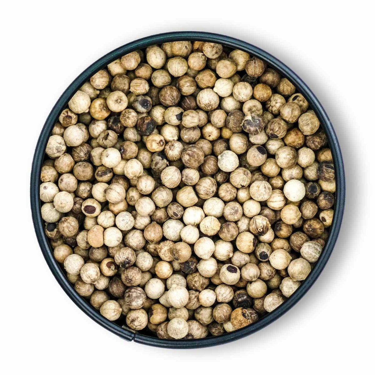 Weißer Bio Pfeffer ist deutlich milder als der schwarze Pfeffer. Sein Aroma ist intensiv und besitzt eine süßliche Note. Verwendet wird er hauptsächlich für weiße Fleischsorten, Fischgerichte, Saucen, Dressings, Marinaden und Fonds.