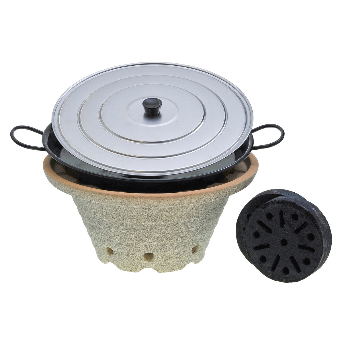 Bratfeuer, Schale CeraFlam mit Granicium beschichtet, Bratpfanne, Aluminiumdeckel, Edelstahl-Ascherost, 2 x Schnellbriketts, Anleitung & Rezeptheft