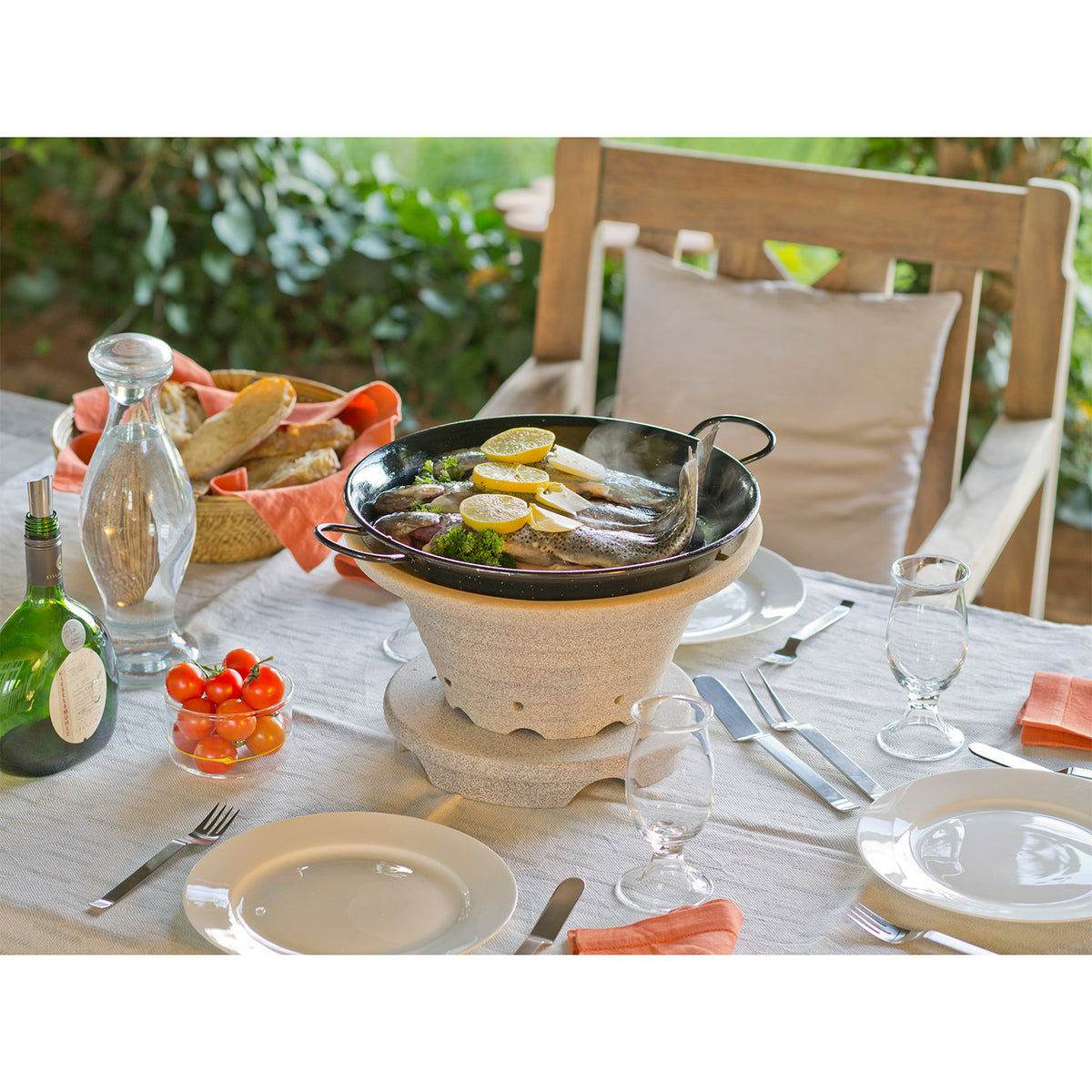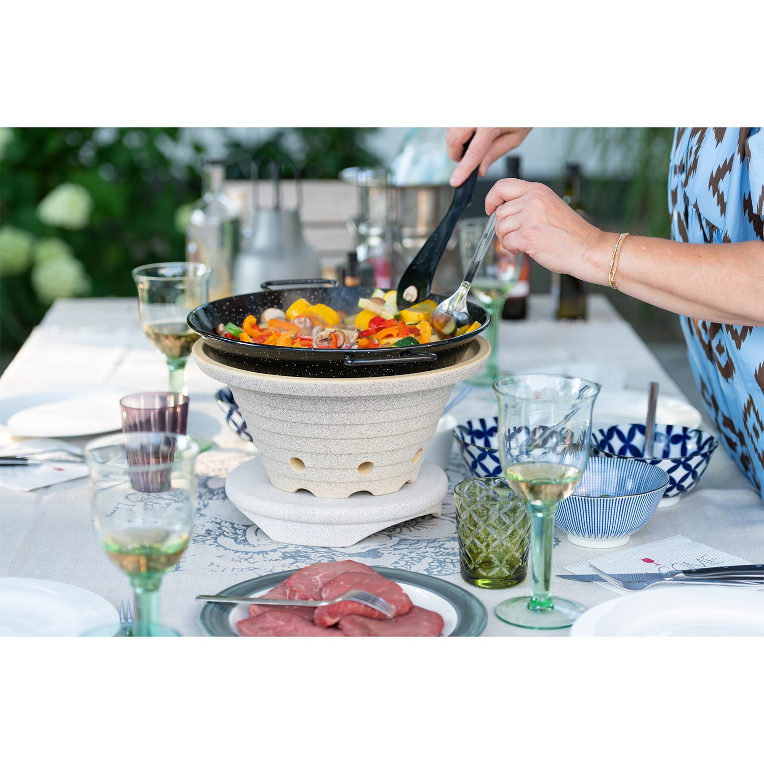 Das Bratfeuer lässt sich ganz einfach bedienen. Als Brennstoff verwenden Sie die mitgelieferten Schnellbriketts, Holzkohle oder Holz. Das Feuer haben Sie im Handumdrehen angezündet, ein leichter Luftzug entfacht die Glut. Dann Pfanne aufsetzen und das Bratvergnügen nimmt seinen Lauf.