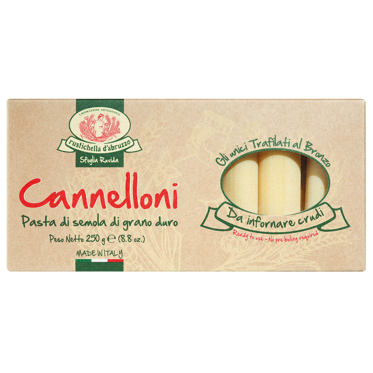 Rustichella dAbruzzo bringt die traditionellen Cannelloni aus den Abruzzen zurück auf den Tisch, die noch von Großmüttern liebevoll von Hand zubereitet werden. Die Cannelloni werden aus bronzefarbenem Weizengrieß hergestellt und langsam bei niedriger Temperatur getrocknet. Sie werden nur gewürzt und direkt roh 40 Minuten lang gebacken. Für die Zubereitung zu Hause empfehlen wir folgende Füllungen: mit frischem Ricotta-Käse, gebratenem Gemüse, etwas Pecorino Abruzzese und einem Spritzer Natives Olivenöl Extra INTOSSO Rustichella oder mit einem Ragout aus PrimoGrano Rustichella Abruzzo Birnentomate und abruzzesischer Fleisch- oder Leberwurst.