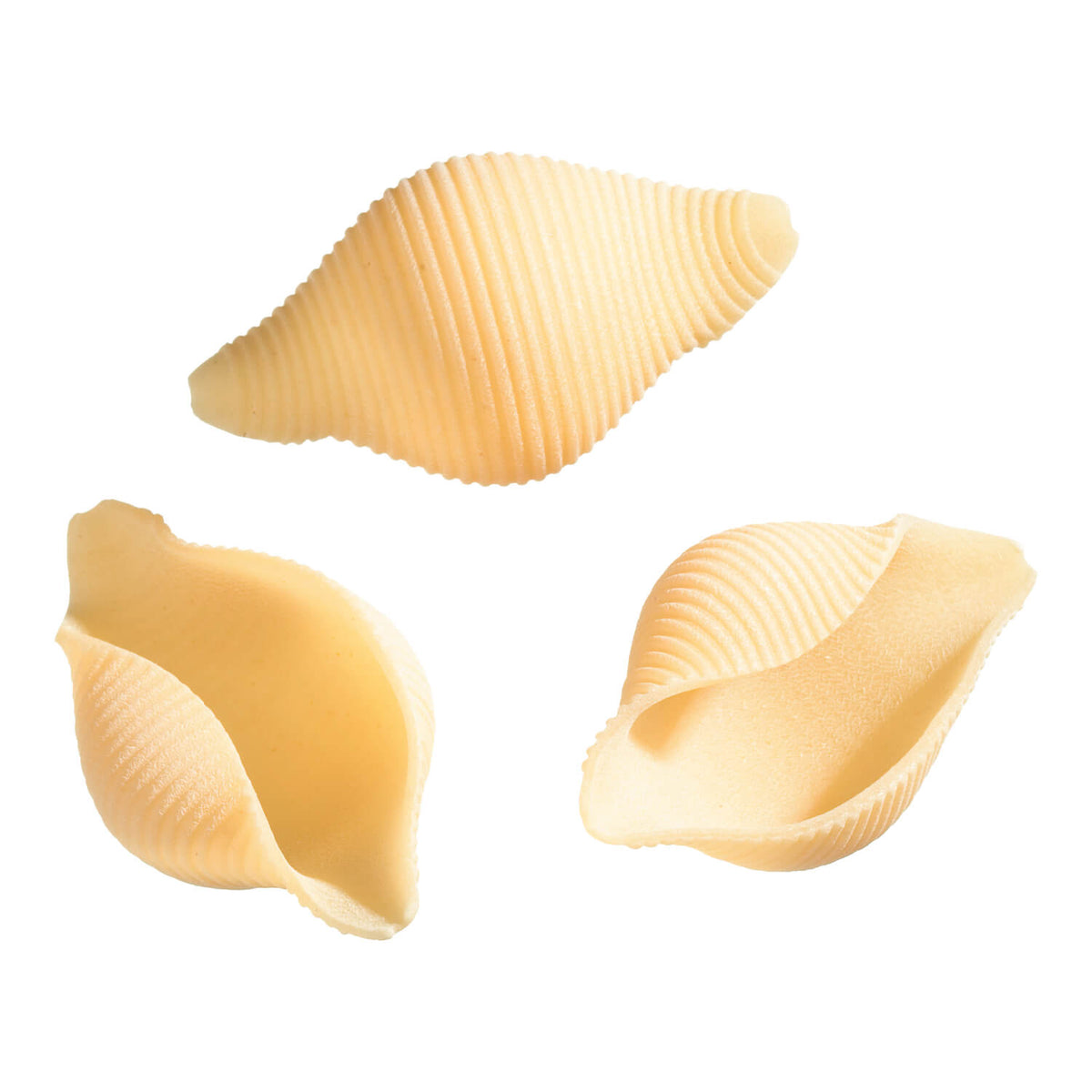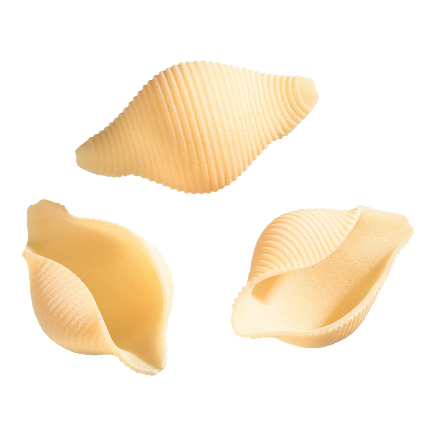 Riesenmuschel-Nudel von Rustichella, ca. 6 cm Länge. Zum Füllen mit Fleisch, Fisch oder Gemüse und zum Überbacken. Beim Kochen viel Wasser verwenden!