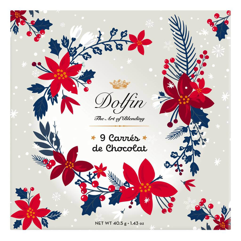 Entdecken Sie die Dolfin 9 Carré Geschenkpackung Winter Flower! Diese exklusive Geschenkbox vom Produzenten Dolfin bietet 9 köstliche Minitafeln in verschiedenen Geschmacksrichtungen, darunter Vollmilch, Kaffee, karamellisierte Haselnüsse, Zartbitter mit Orange und mehr.
