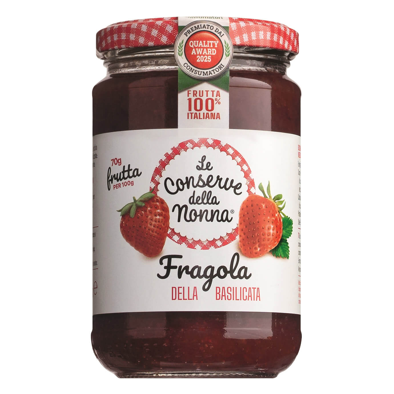 Erdbeere, Zucker, Geliermittel, Pektin, Säuerungsmittel, Citronensäure, Antioxidationsmittel, Ascorbinsäure, hergestellt aus 70g Früchten je 100g, Kann Spuren enthalten von, Milch , Soja , Sellerie , Schalenfrüchte , Fisch , Weichtiere fett : potentiell allergene Substanz