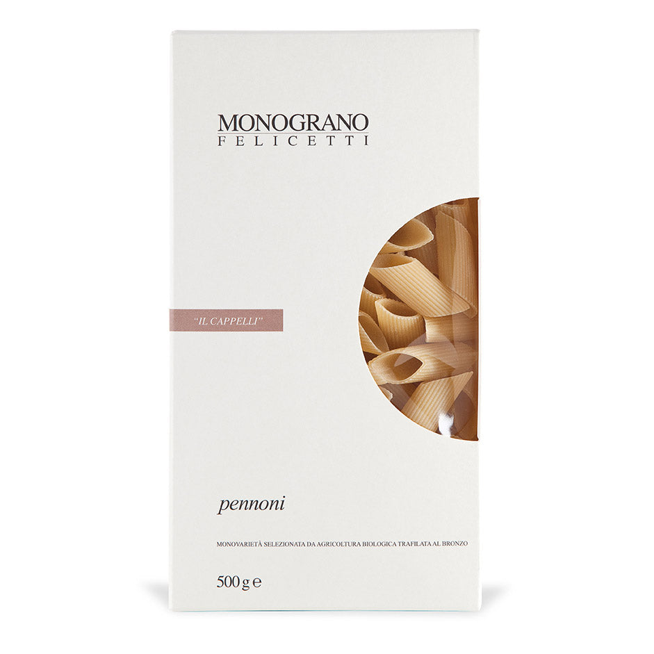 Felicetti Pennoni - eine extra große Nudel aus Harzweizen, perfekt für schmackhafte, reichhaltige Saucen. Ihre großen Riefen absorbieren die besten Kombinationen für ein intensives GeschmackserIebnis. Die Kochzeit beträgt 10 Minuten.
