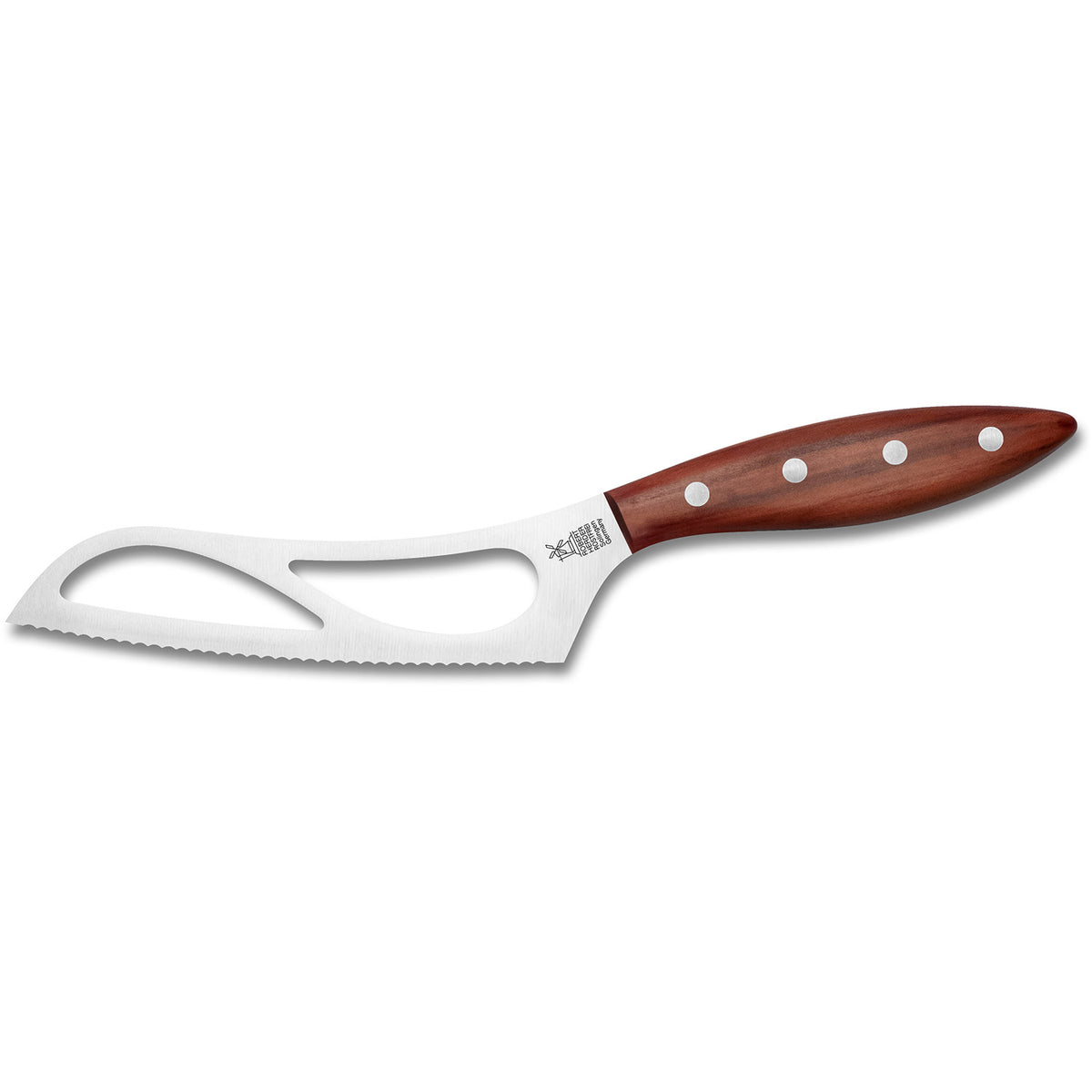Sie verhindern das Anhaften bei weichen sowie schnittfesten Käsen. Gleichzeitig gibt die Breite genügend Stabilität, um härtere Käse wie z. B. mittelalten Gouda, Provolone, Gruyère oder ähnliche Käsearten leicht zu durchschneiden. Für eine ansehnliche Schnittfläche des Käses, sind die tropfenförmigen Aussparungen besonders auspoliert und die Kanten von Hand geglättet. Durch die dünn eingeschliffene konkave Welle zerteilt das Messer die Käse ohne Mühe. Auch hier ermöglicht die hohe Griffwinkelung viel Handfreiheit beim Schneiden.