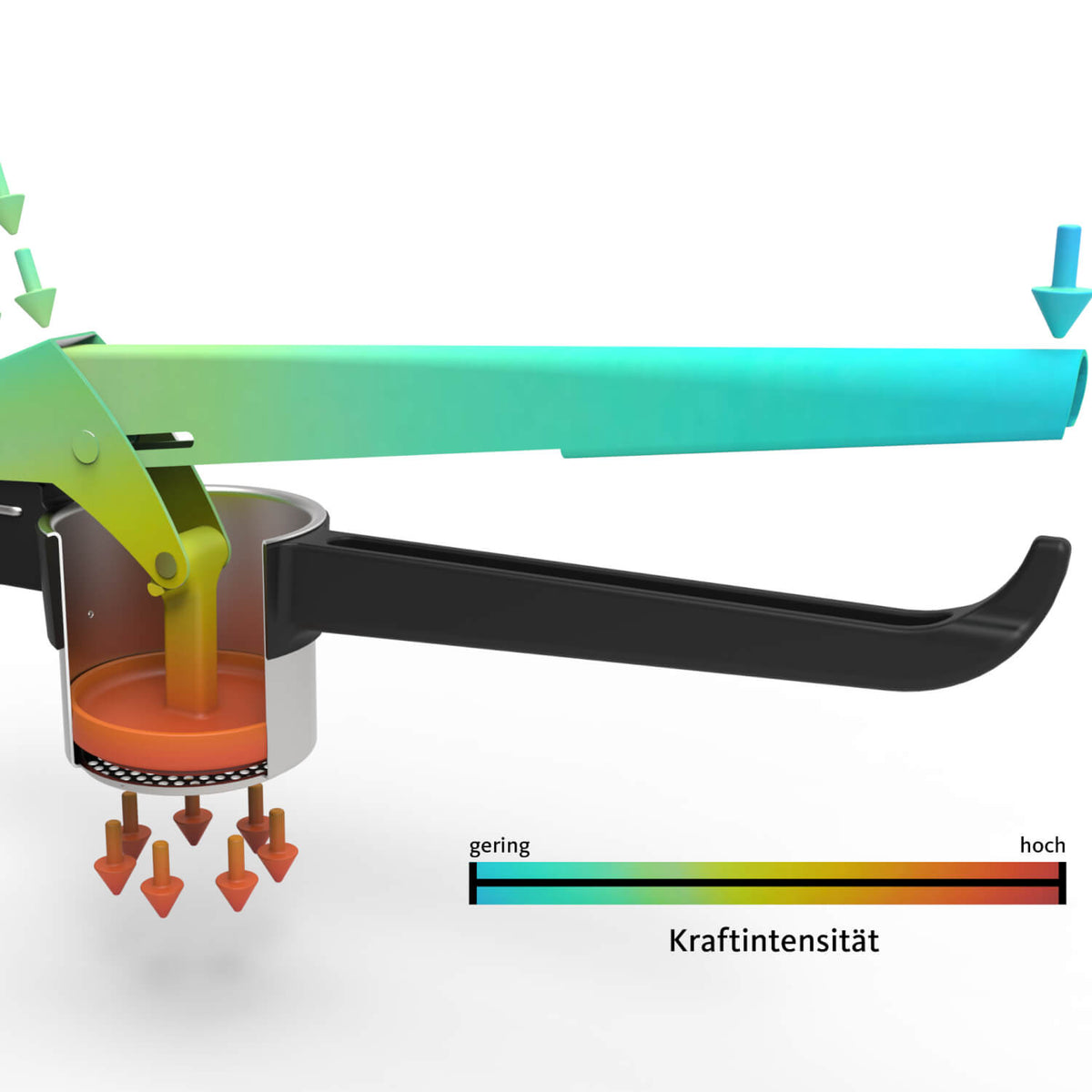 Die Kartoffel-, Saft- und Spätzlepresse erleichtert aufgrund ihrer optimierten Hebelmechanik wirkungsvoll das Pressen. Der Stempel bleibt immer waagerecht im Behälter, so wird eine optimale Kraftausbeute sichergestellt – und nichts quillt an den Seiten hinaus.