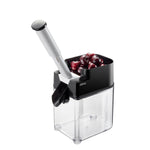 Egal, ob die frische Ernte oder die konservierte Variante: auch große Mengen von Kirschen werden mit diesem Entkerner im Handumdrehen in kernlose Früchte umgewandelt. Einfache Bedienung: Die obere Schale mit Kirschen füllen und den Schlagstempel drücken. Dabei fallen die Kerne in den großen Auffangbehälter, das fruchtige Ergebnis rutscht seitlich in eine separate Schüssel.