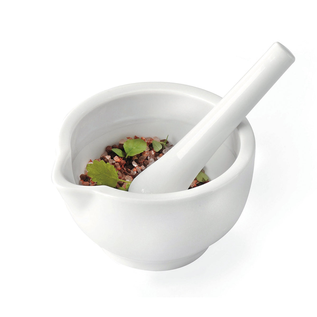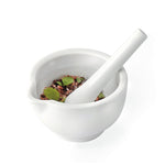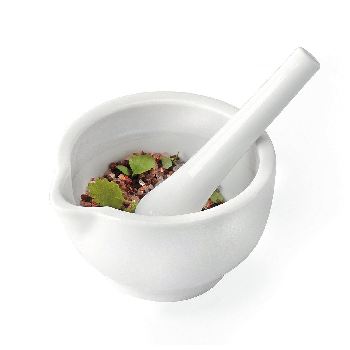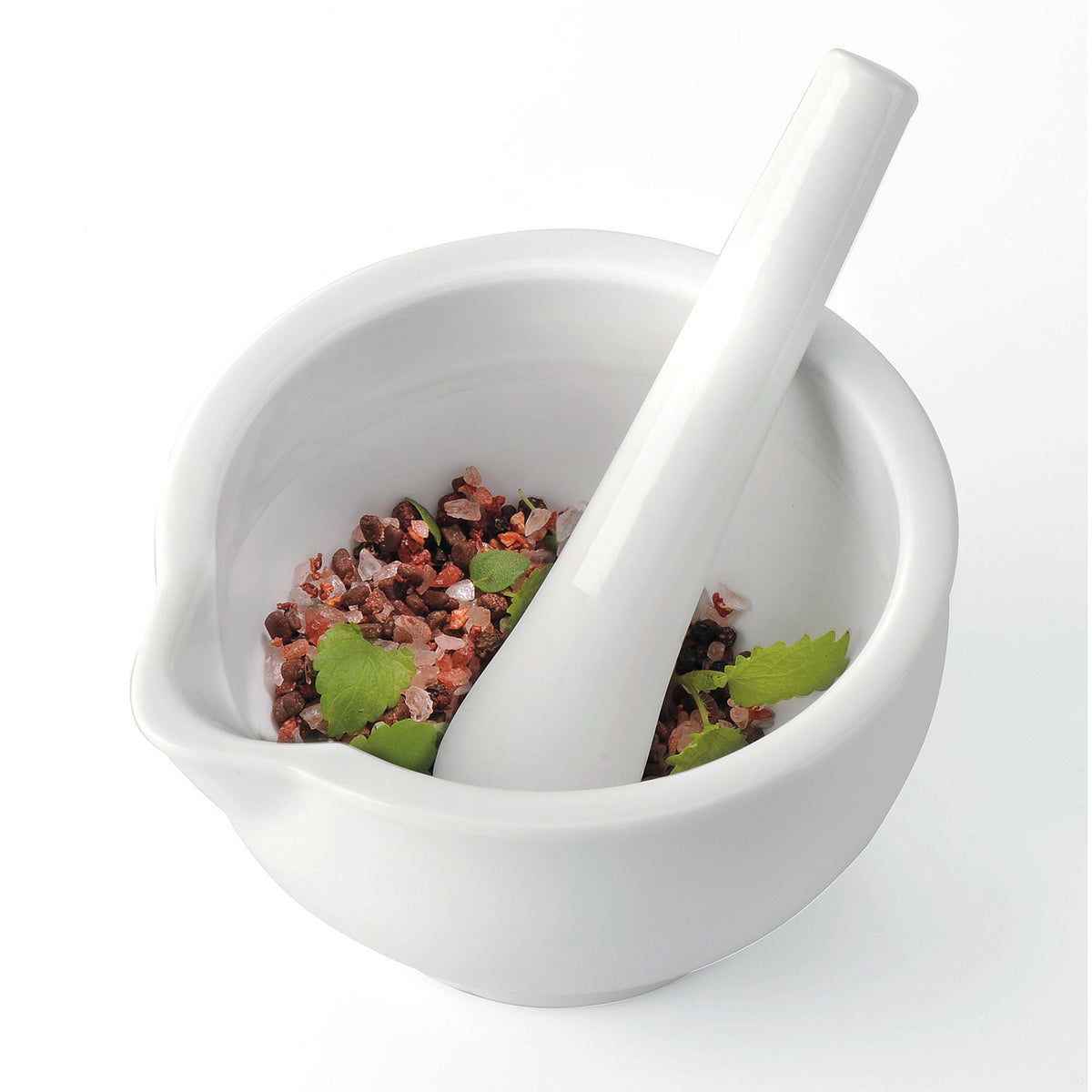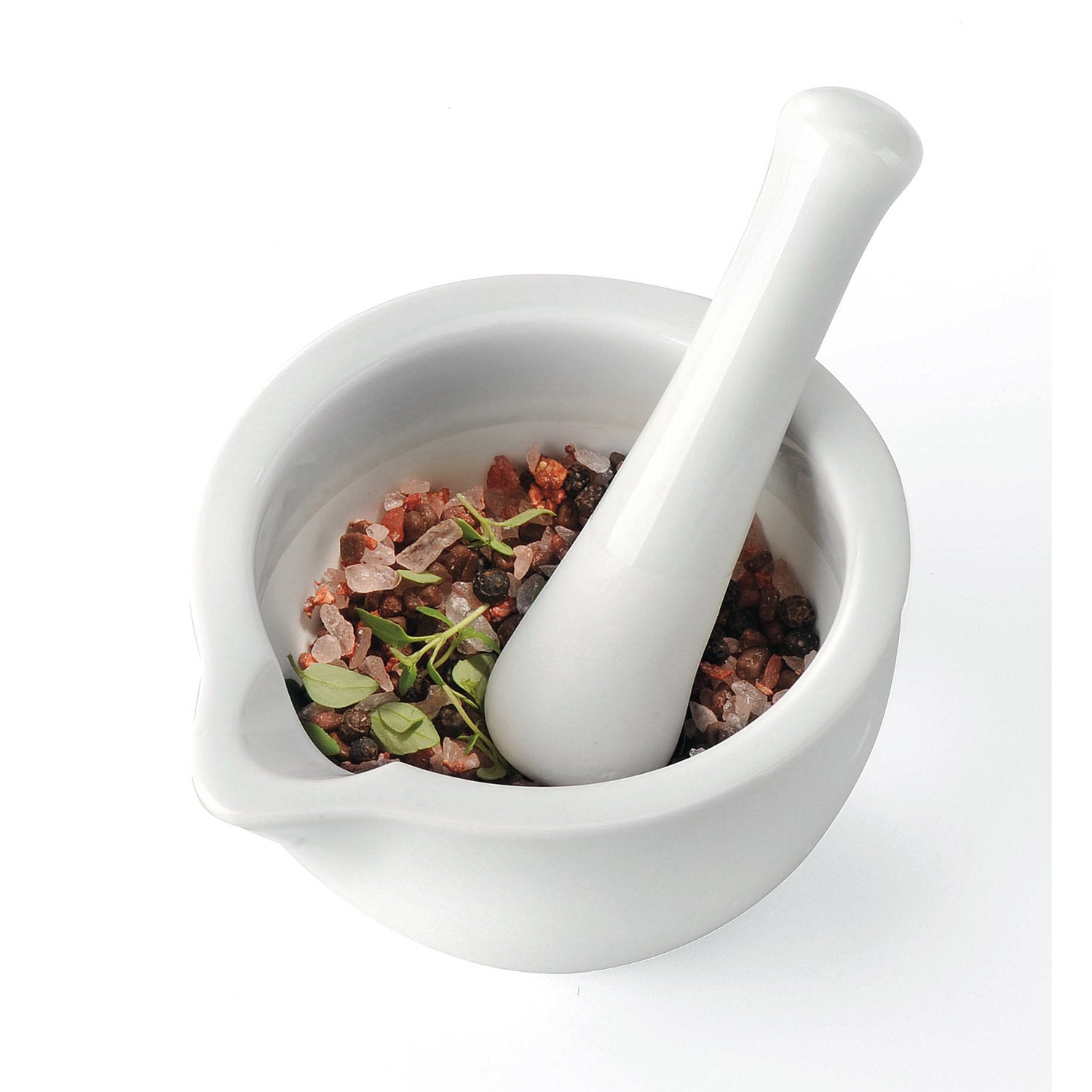 Zum Zermahlen von Gewürzen und Kräutern, z.B. für die Zubereitung von Pesto o 2 tlg. Set: Schale und Stößel o Sehr gutes Mahlergebnis durch aufgerauten Boden der Schale und Kopf des Stößels o Mit Ausgießnase o Porzellan o Spülmaschinengeeignet Mit dem Mörser gelingen eigene Gewürzmischungen im Nu. Dieser massive Mörser ermöglicht es, Gewürze nach traditioneller Art frisch zu zerstoßen, um das volle Aroma zu erhalten. Der gerundete Boden und der massige Stößel eignen sich hervorragend für die Zubereitung von Kräuterpasten, Gewürzsalzen und italienischem Pesto.