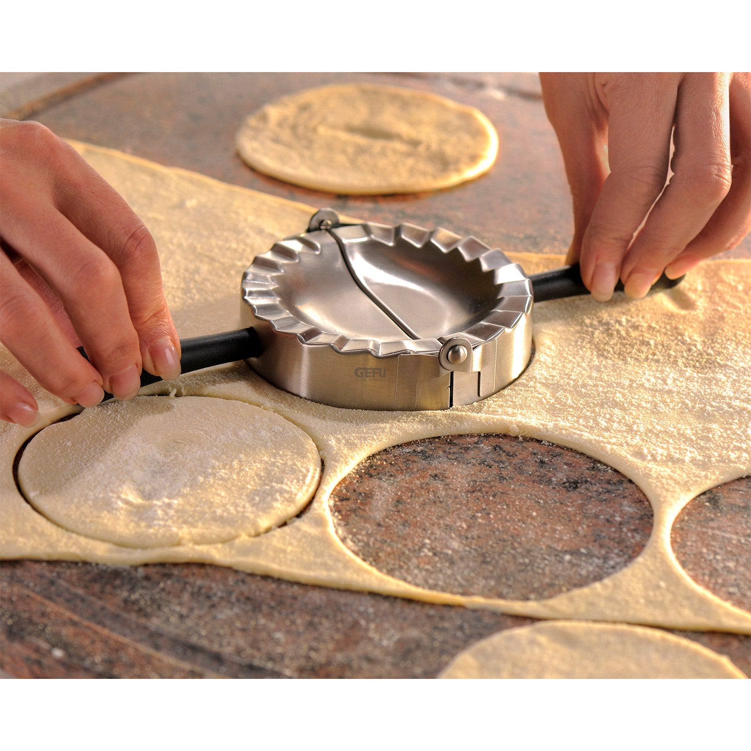 Praktischer Former zur Herstellung frischer Ravioli oder Maultaschen. Einfach den Teig mit der Unterseite ausstechen, auf die Innenseite legen und befüllen.