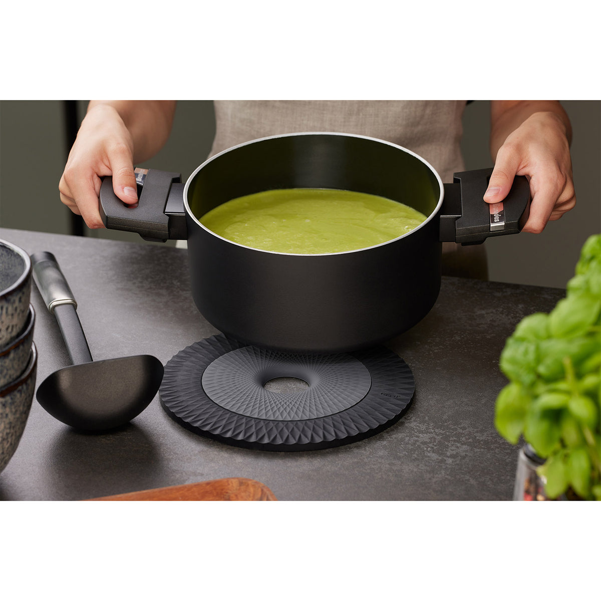 Der GEFU Circo ist der clevere 2-in1-Silikonuntersetzer für heiße Töpfe und Pfannen von klein bis groß. Isolierstark und besonders rutschsicher durch seine spezielle Wabenstruktur.