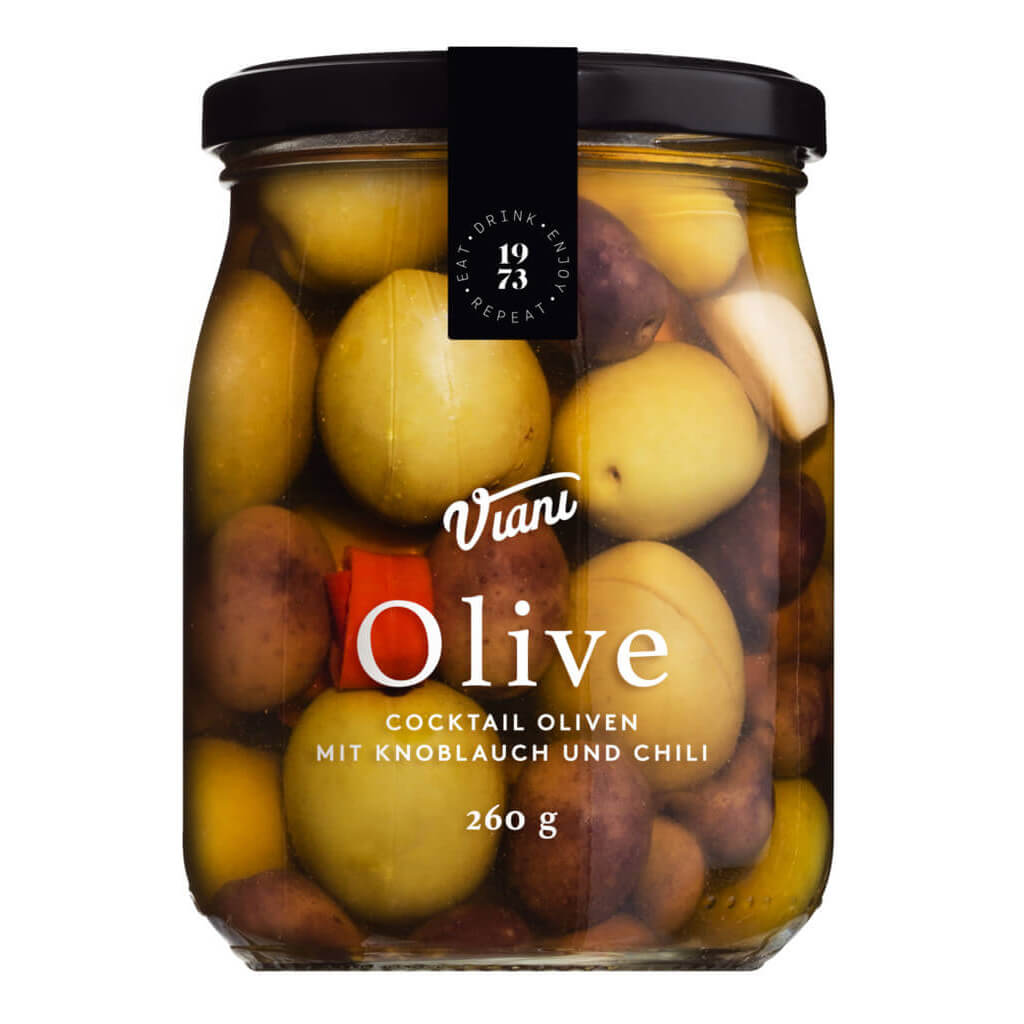 Gemischte Cocktail Oliven mit Knoblauch und Chili, 260 g