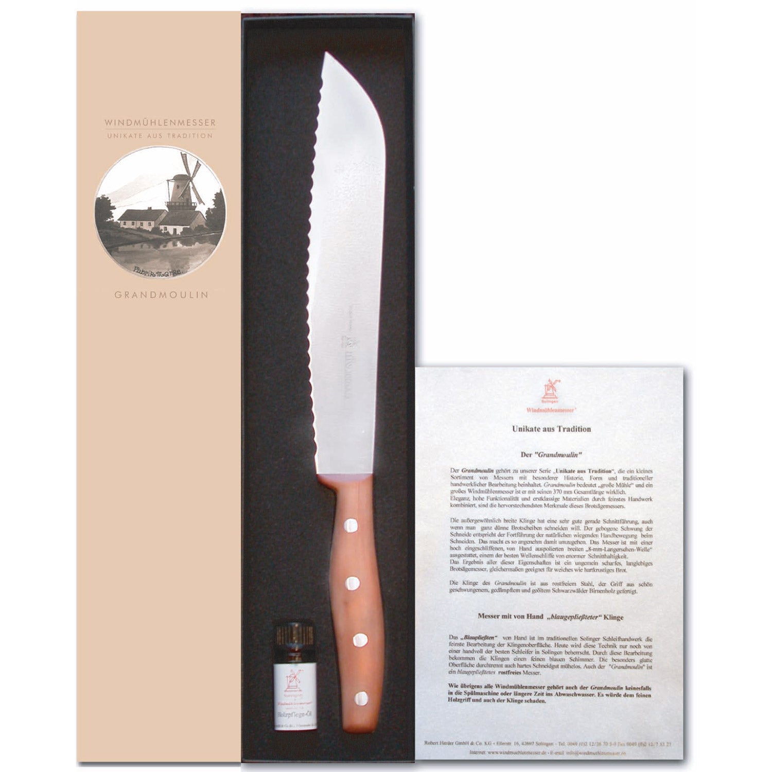 Das Brotmesser mit Griff Pflaume Grandmoulin gehört zu der Serie „Unikate aus Tradition“, die ein kleines Sortiment von Messern mit besonderer Historie, Form und traditioneller handwerklicher Bearbeitung beinhaltet. Hier im Geschenk-Set mit Holzpflegeöl. Grandmoulin bedeutet „große Mühle“ und ein großes Windmühlenmesser ist er mit seinen 370 mm Gesamtlänge wirklich.