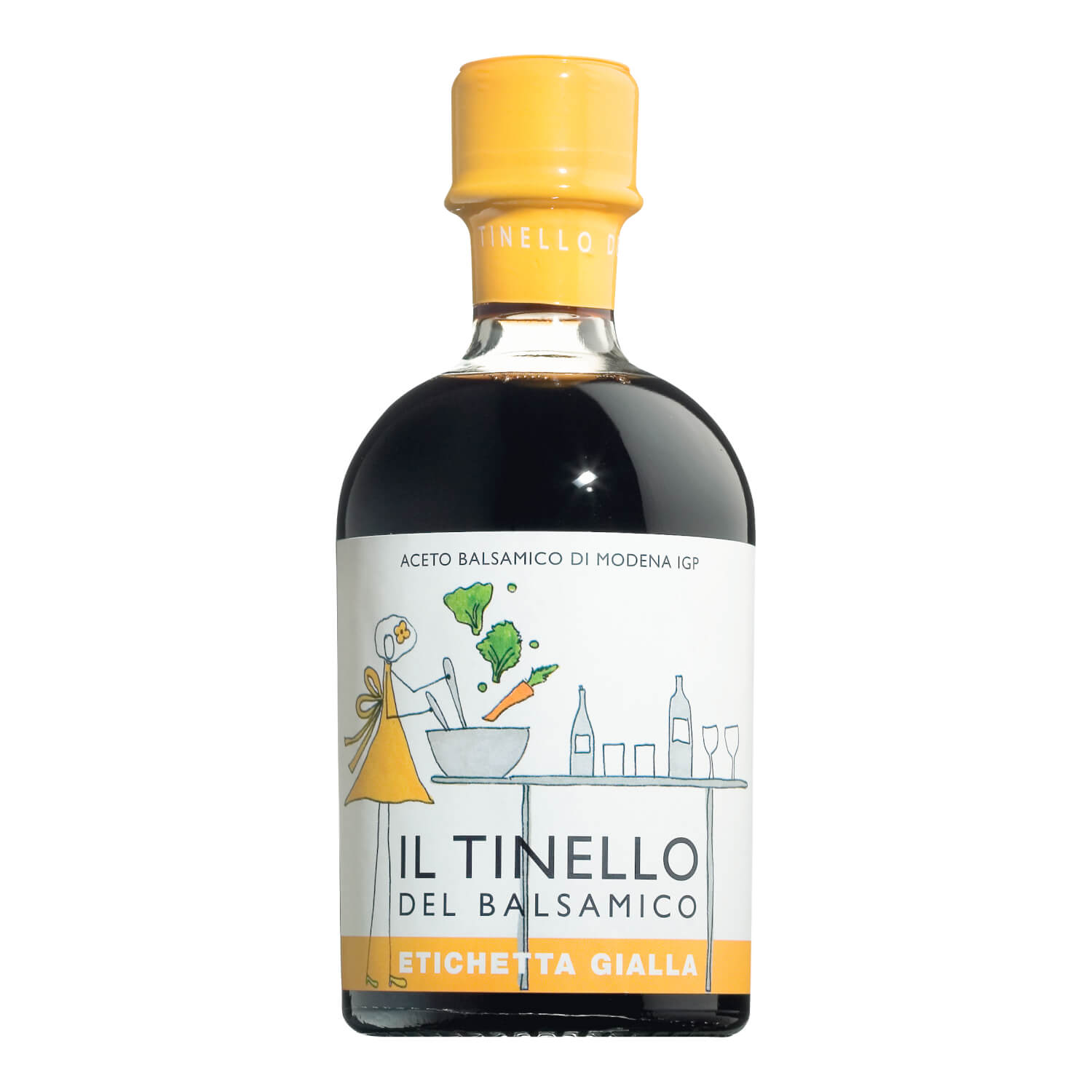 Familie Crotti produziert seit über 40 Jahren Balsamessige auf höchstem Niveau. Ihr jüngster, der gelbe Tinello, reifte circa ein Jahr im Fass. Der bernsteinfarbene Balsamessig aus eingekochtem Traubenmost und hochwertigem Weinessig besitzt eine gut eingebundene Säure, leichte Röstnoten und schmeckt dabei sauber und harmonisch. Auch das Holzfass ist ganz fein nachvollziehbar. Er eignet sich sehr gut für Rohkost, in Vinaigrettes und Dips.