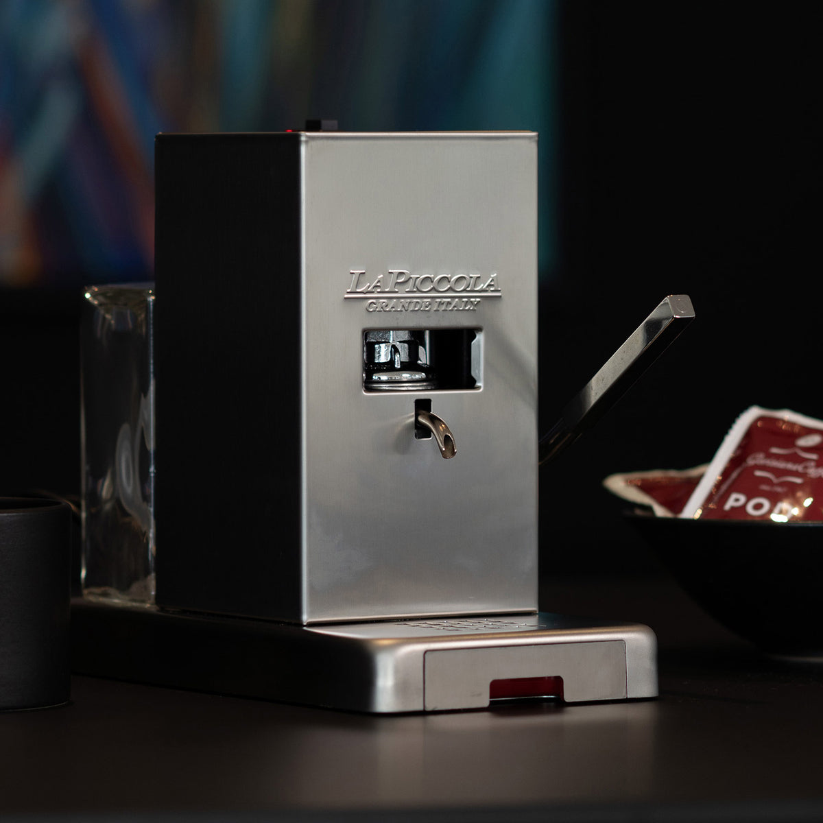 Die manuelle La Piccola Piccola Espressomaschine für ESE-Pads ist klein in ihren Ausmaßen, zaubert aber einen verführerischen Espresso. Die Padmaschine in mattem Edelstahl verbindet die Liebe zum Detail mit formschönem Design und einfachster Bedienung.