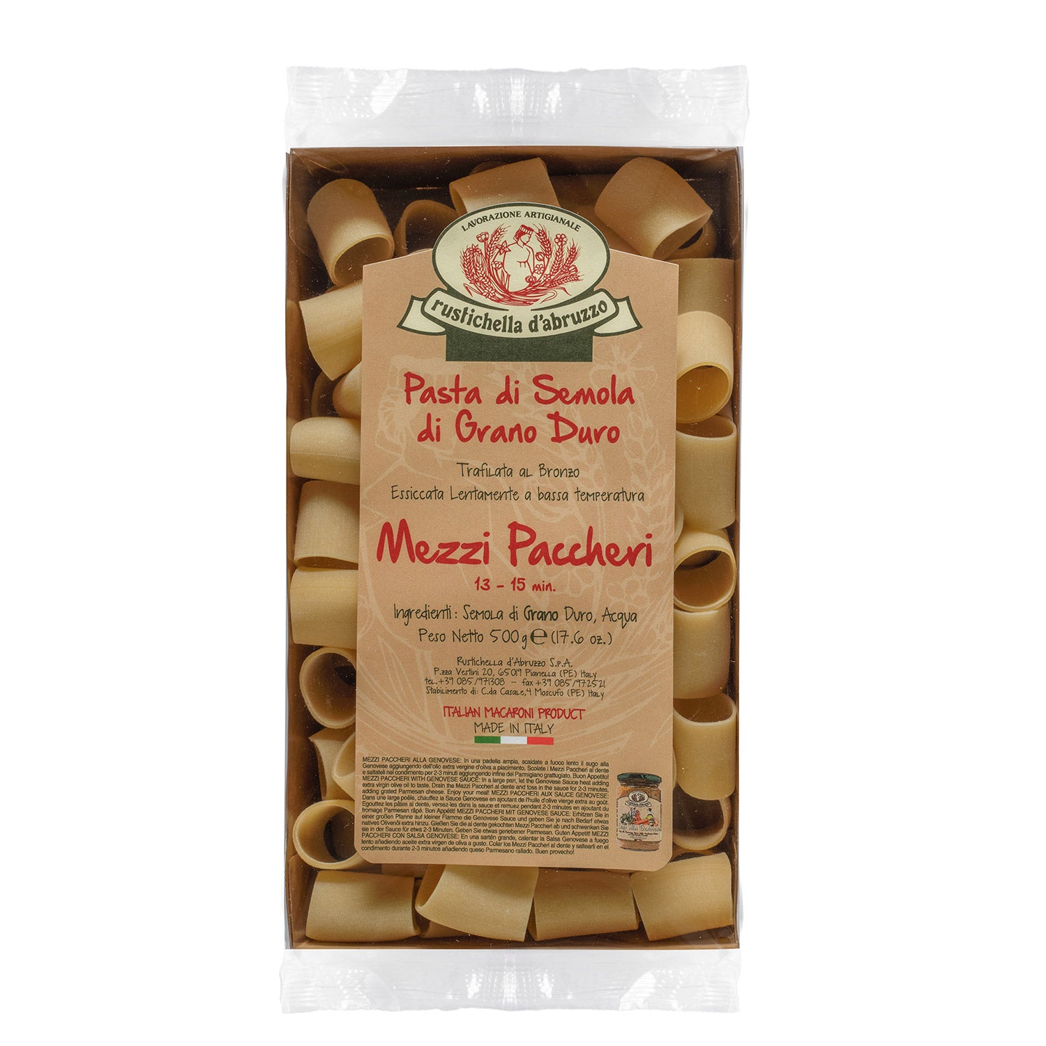 Mit der gleichen Bronzeform, die für die Herstellung der Paccheri verwendet wird, bietet Rustichella dAbruzzo die Mezzi Paccheri an, ein Format mit dem gleichen Durchmesser, aber der halben Länge des klassischen Pacchero. Dank ihrer rauen Oberfläche eignen sich die Mezzi Paccheri hervorragend zu Meeresfrüchten und Krustentieren für einen ersten Gang mit typisch mediterranem Geschmack und Aroma. Die Kochzeit beträgt 13-15 Minuten.