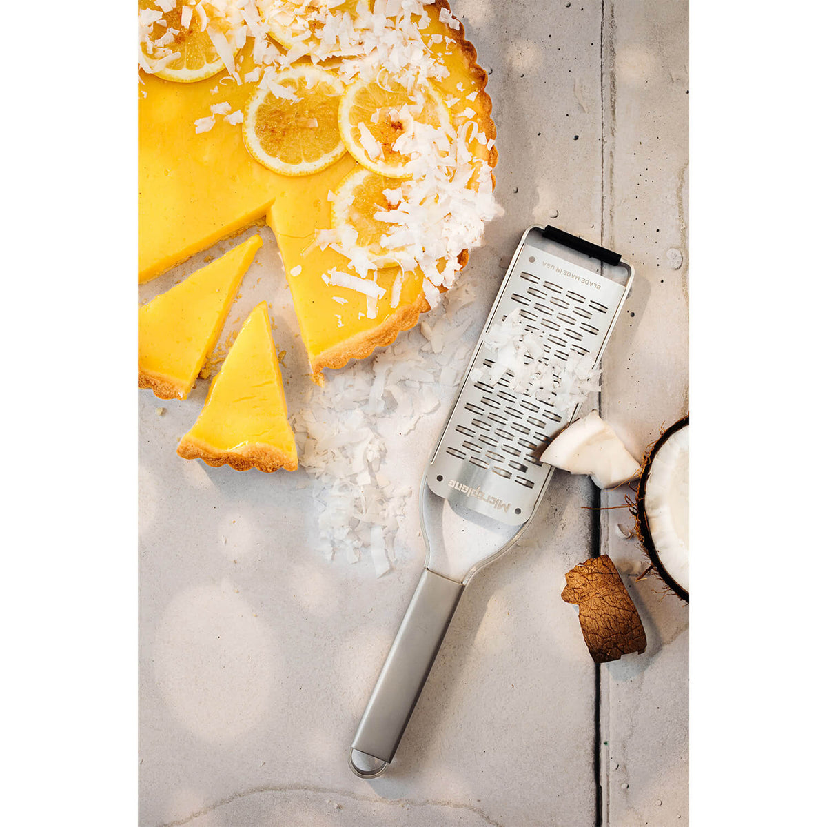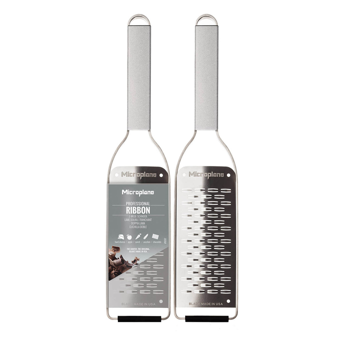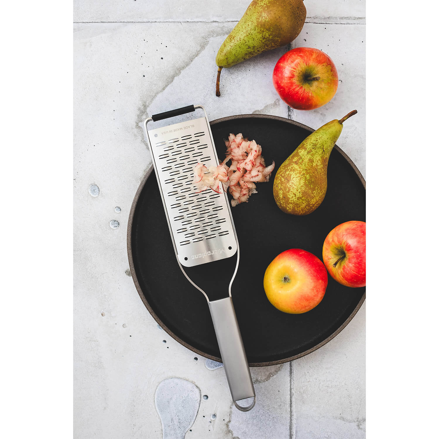 Die Microplane 2-Wege-Schneide bietet als einzige Klinge die Möglichkeit, in beide Richtungen zu reiben – perfekt, wenn Sie schnell größere Mengen raspeln möchten. Ob Zucchini, Weich- oder Hartkäse, Äpfel, Kartoffeln, Zucchini oder Schokolade : Mit dieser Reibe sparen Sie Zeit und erreichen ideale Ergebnisse. Die feinen Streifen, die Sie beispielsweise aus Karotten zaubern, eignen sich wunderbar zum Dekorieren von Salaten oder zum Garnieren Ihrer Gerichte und verleihen diesen eine besondere Optik und Frische.