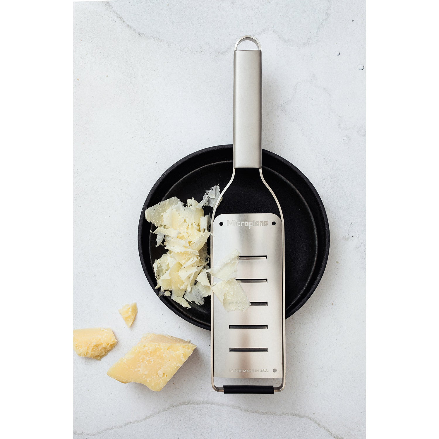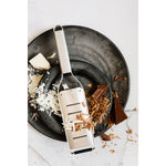 Die Große Raspel der Microplane New Professional Serie ist mehr ein feiner Hobel als eine klassische Reibe und ermöglicht hauchdünne Späne und gleichmäßige Röllchen von Zutaten wie Käse, Schokolade, Butter oder Zucchini . Die spezielle Anordnung von fünf länglichen Klingen in präzisen Abständen sorgt dafür, dass Sie in einem Zug mühelos und zeitsparend hobeln können. Das Ergebnis: gleichmäßige, feine Scheiben, die nicht nur optisch überzeugen, sondern auch perfekt in Textur und Konsistenz sind.