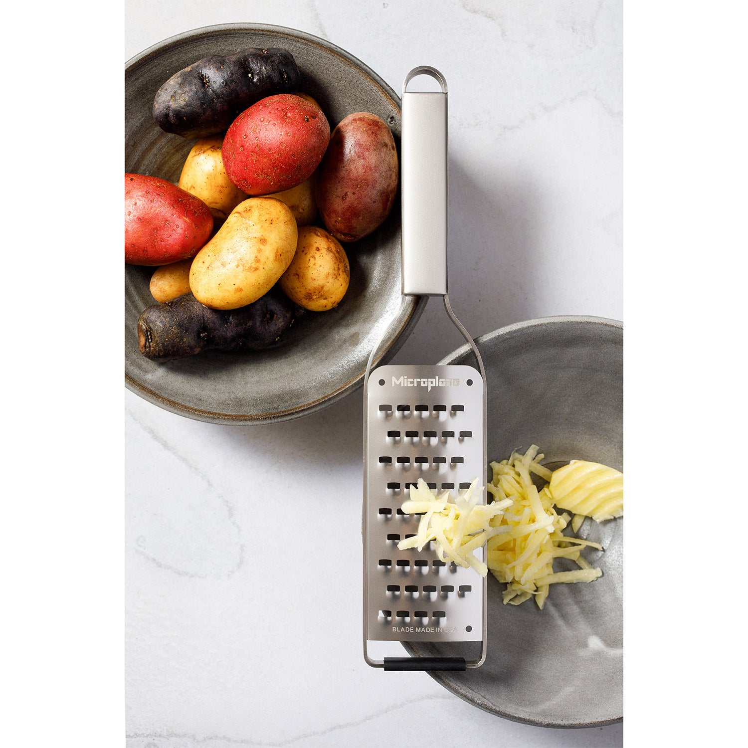 Die sehr grobe Reibe von Microplane ist wie geschaffen für alle Zutaten, die Volumen und grobe Struktur benötigen und dabei Ihre Aromen behalten sollen. Ob Kartoffeln, Karotten, Zucchini, Äpfel oder Käse , die ultrascharfen Klingen erzielen mühelos ein perfektes Ergebnis. Dank der präzisen Anordnung der Klingen können Sie Zutaten in fließenden Zügen mit wenig Kraftaufwand verarbeiten. So sparen Sie nicht nur Zeit, sondern werten Ihre Gerichte optisch und geschmacklich auf.