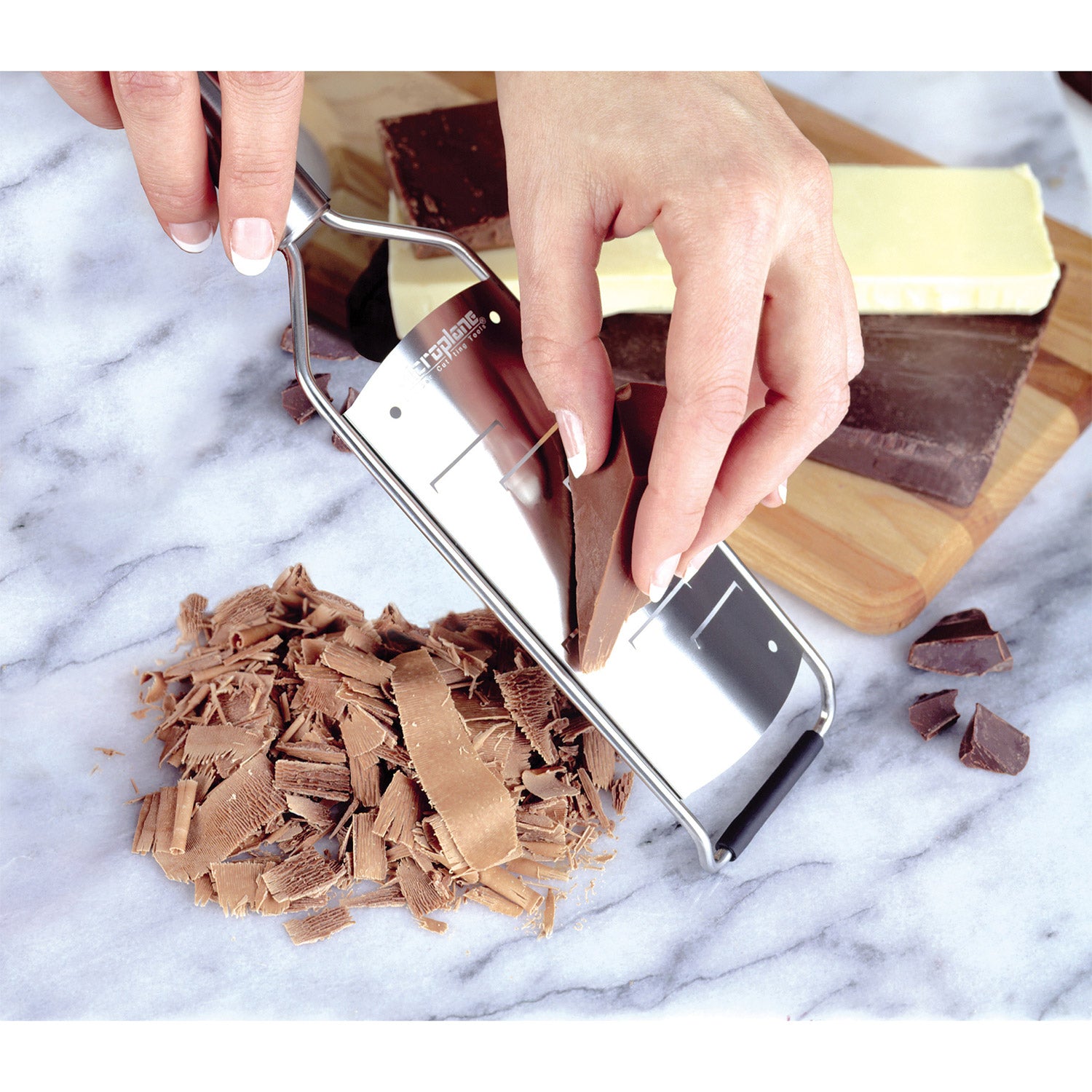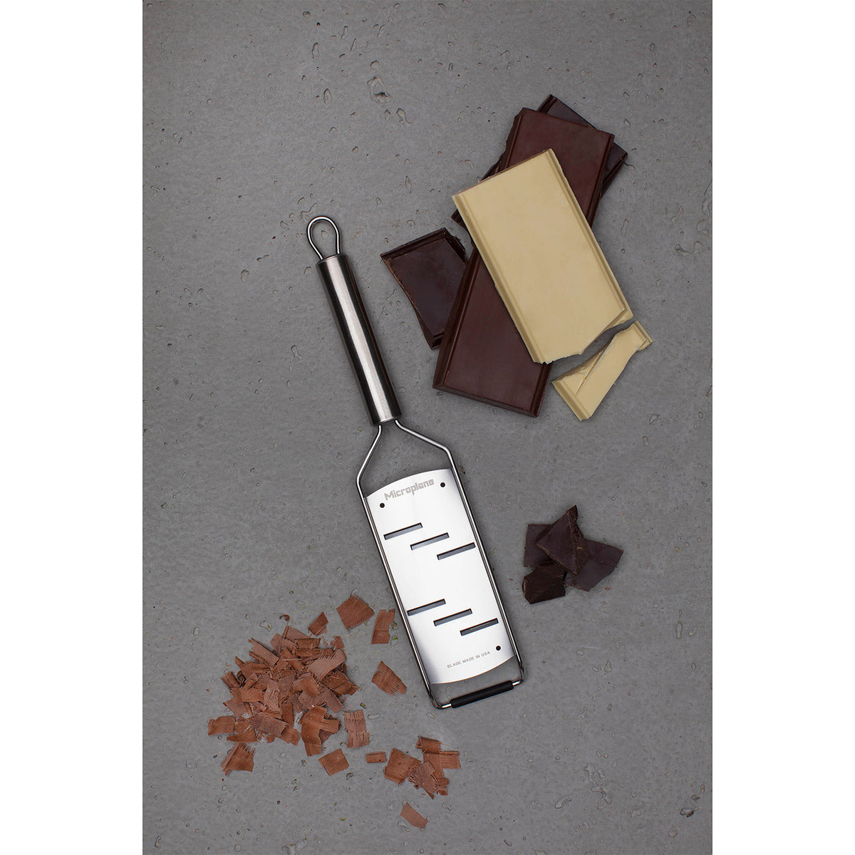 Mit der großen Raspel und deren sechs länglichen, messerscharfen Klingen können Sie mühelos Schokolade, Karotten, Käse, Trüffel, Butter uvm. in breite Blättchen hobeln.