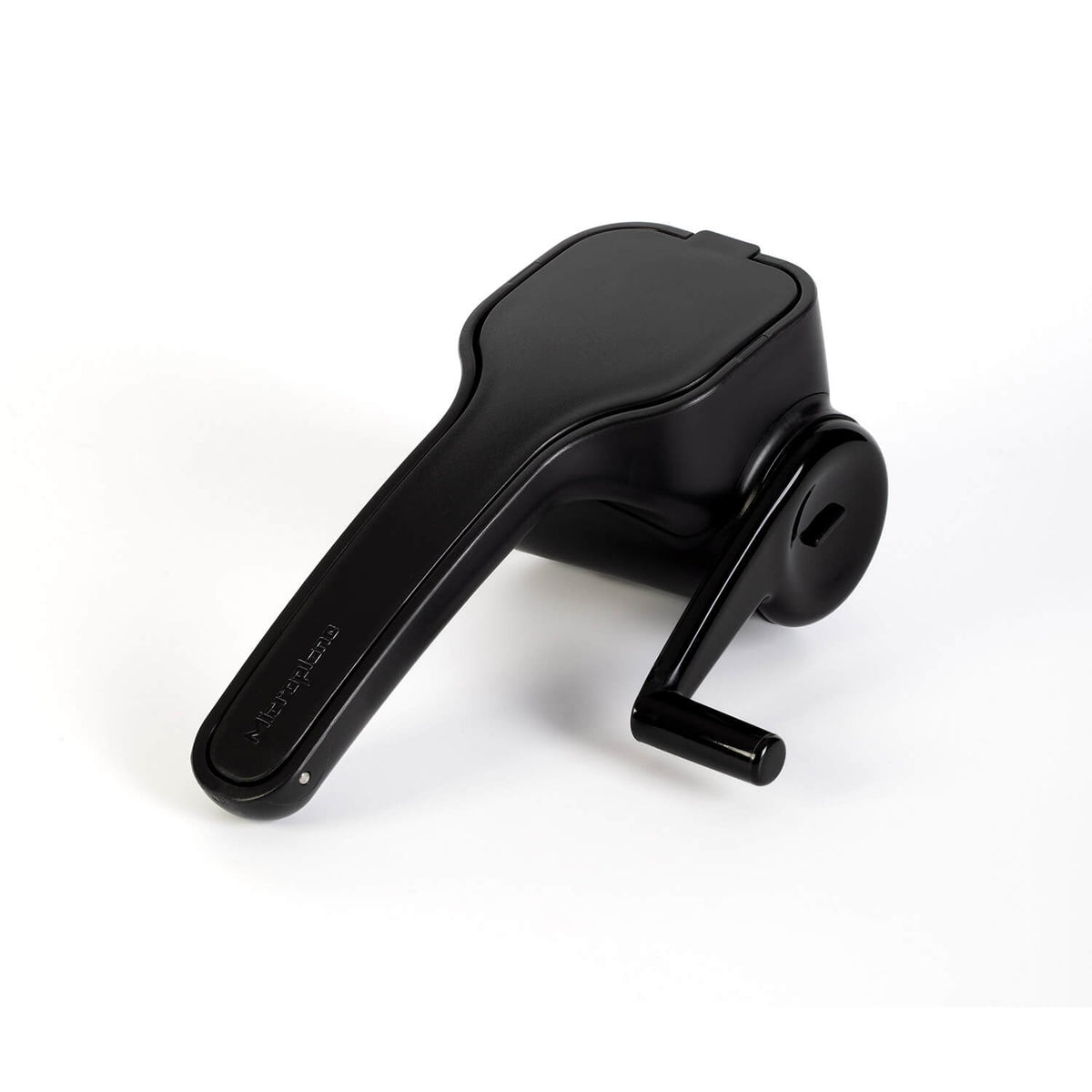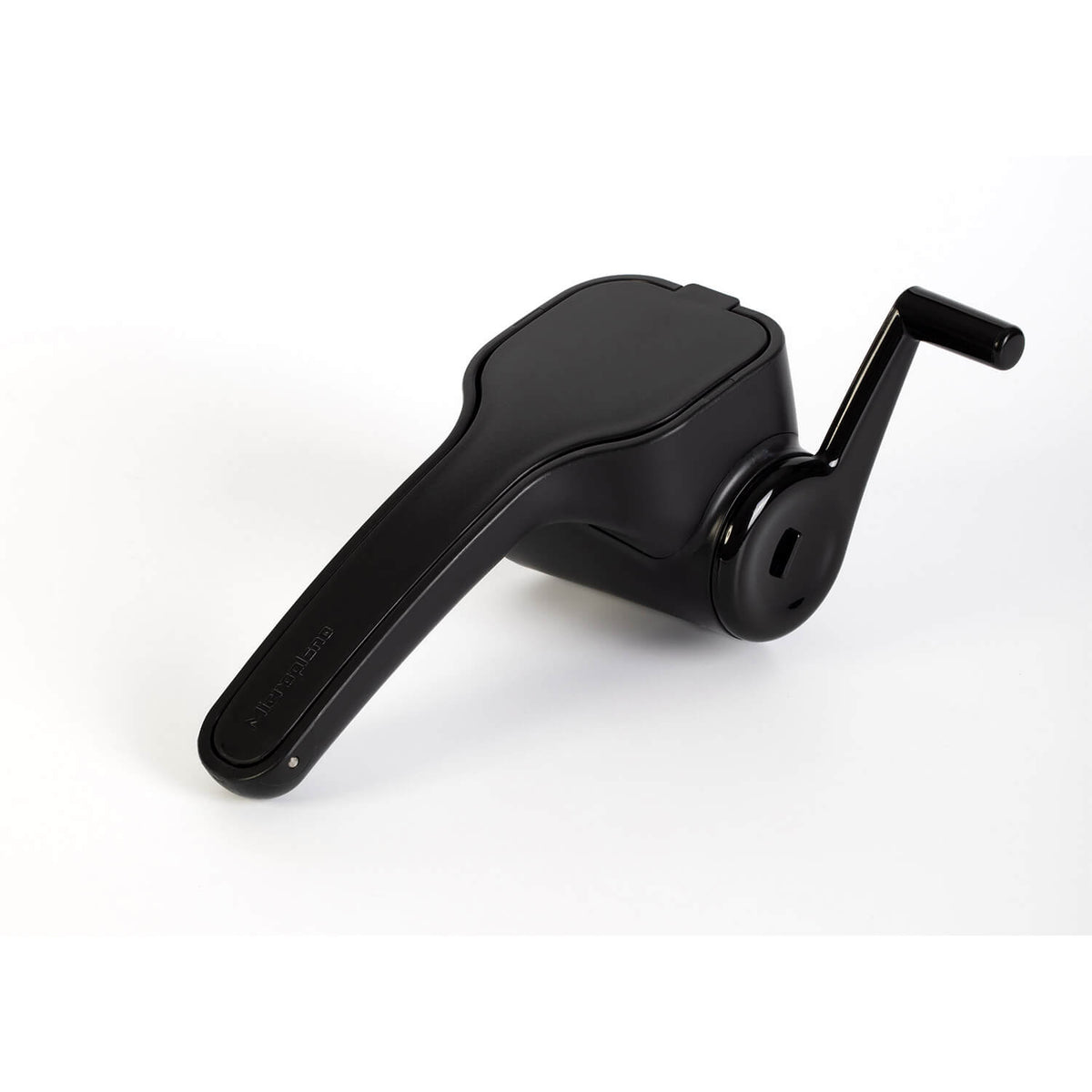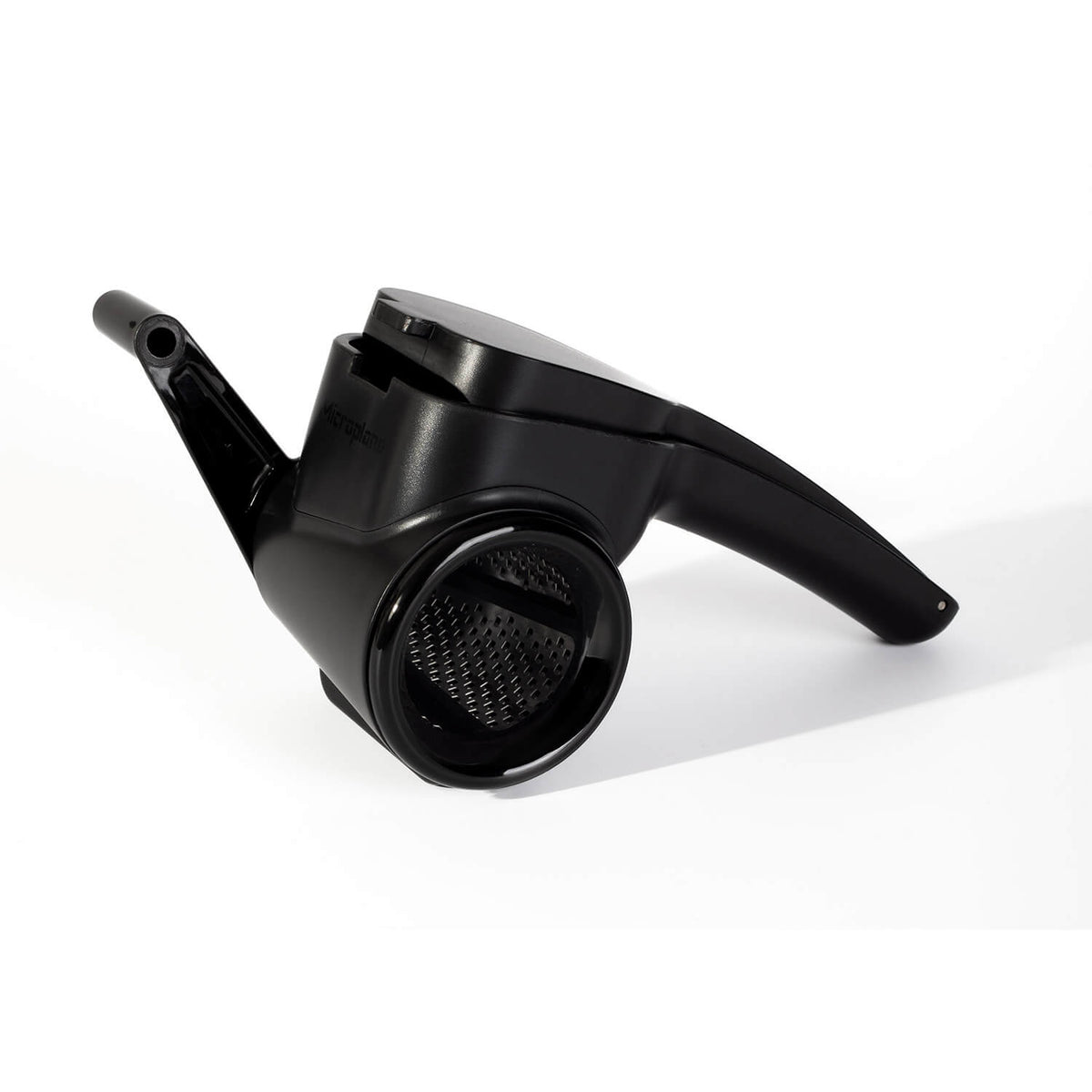Durch leichten Druck auf den ergonomischen Griff halten Sie das Reibgut, dann drehen Sie an der Kurbel, und das Reiben gelingt im Handumdrehen. Die trichterförmige Klinge lässt das Reibgut leicht aus der Trommel fallen. Die schwarze Reibe mit matten Edelstahlapplikationen liegt dank des ergonomischen Griffs gut in der Hand.