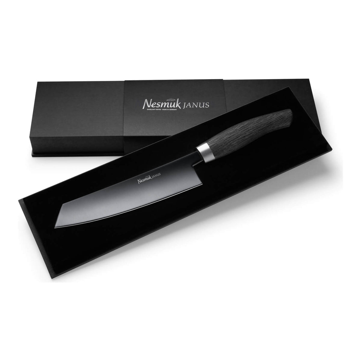 Nesmuk JANUS mit Griff Karelische Maserbirke – unverkennbar an der schwarzen Klinge – wird aus einem Hochleistungsstahl mit Niobanteil gefertigt und mit einer hochwertigen Diamond-like-carbon Beschichtung (DLC) veredelt, die die funktionalen Eigenschaften der Klinge optimiert. Das Kochmesser mit einer 180 mm langen und 4 mm starken, einseitig hohlgeschliffenen Klinge ist der Allrounder, mit dem man rund 80 % aller Schneidaufgaben erledigen kann. Als „Basis-Messer“ in jeder Küche unverzichtbar und vielseitig einsetzbar.