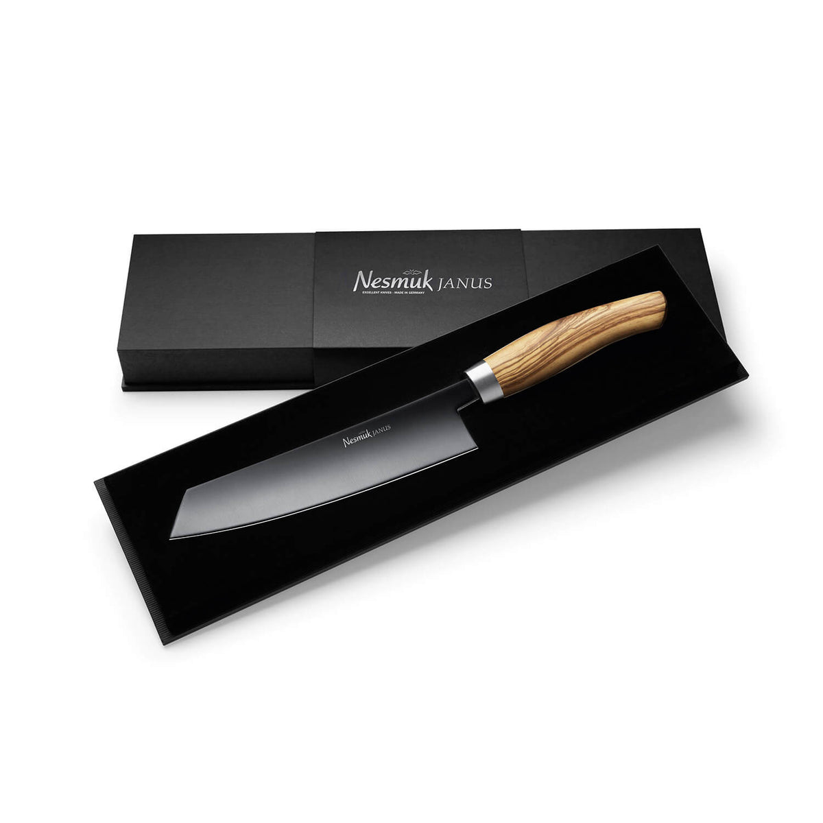 Das Nesmuk JANUS verbindet das handwerkliche Können und die langjährigen Erfahrungen von Nesmuk mit modernsten Materialien und Fertigungsmethoden. Die Besonderheit der Kollektion JANUS ist die hochwertige DLC-Beschichtung (Diamond-like Carbon). Diese Beschichtungstechnologie wurde für höchste Beanspruchungen entwickelt: Die nur wenige Mikrometer starke, aber extrem harte, amorphe Kohlenstoff-Schicht ist unempfindlich gegenüber Säuren, Basen sowie extremen Temperaturen, zeichnet sich durch niedrige Reibwerte und enorme Kratzfestigkeit aus und optimiert so die funktionalen Eigenschaften der Klinge. Der patentierte Nesmuk Stahl enthält zudem das seltene Element Niob – dieses sorgt für das feinst-mögliche Stahlgefüge trotz Rostträgheit und ermöglicht die extreme Schärfe sowie erhöhte Standzeit und Schnitthaltigkeit.
