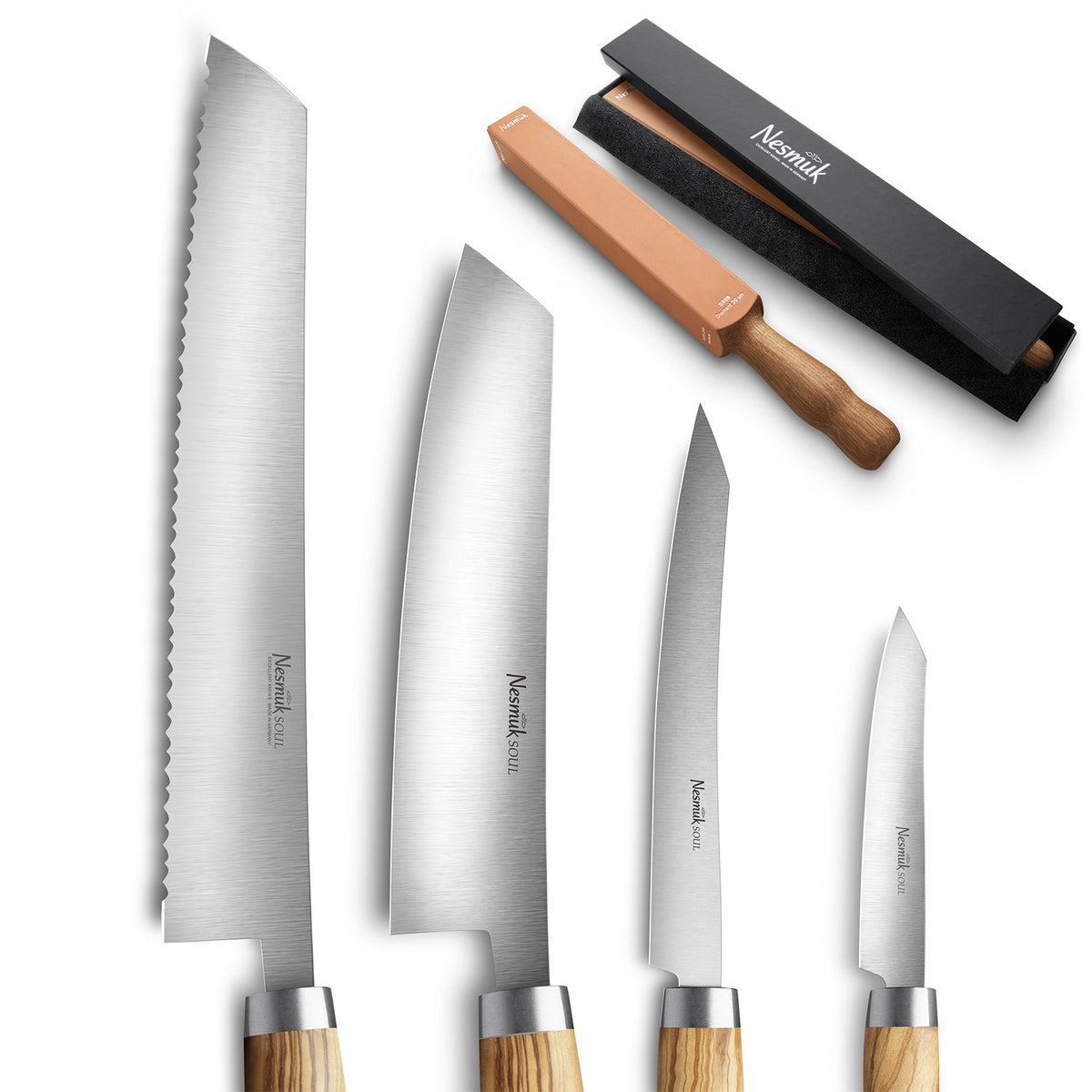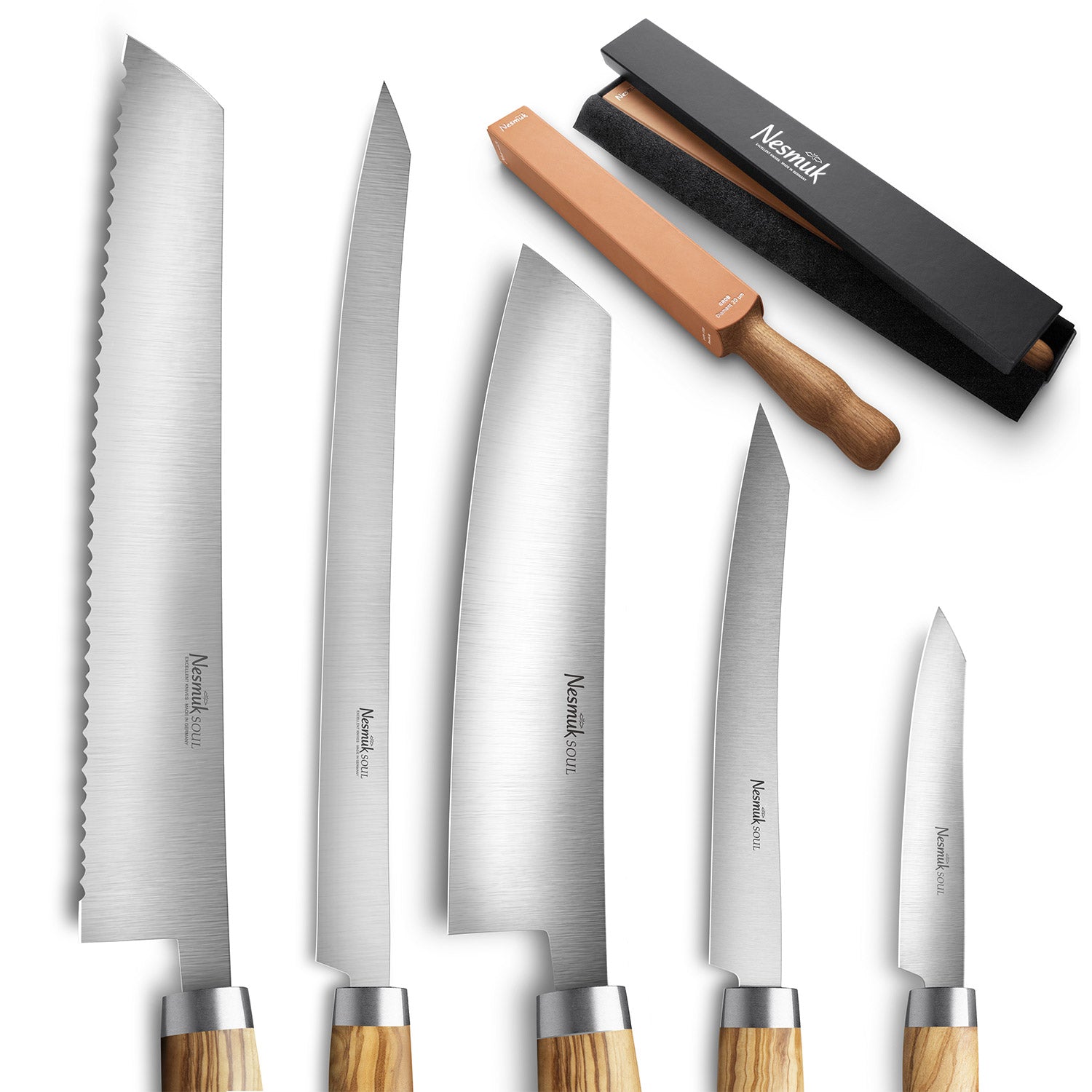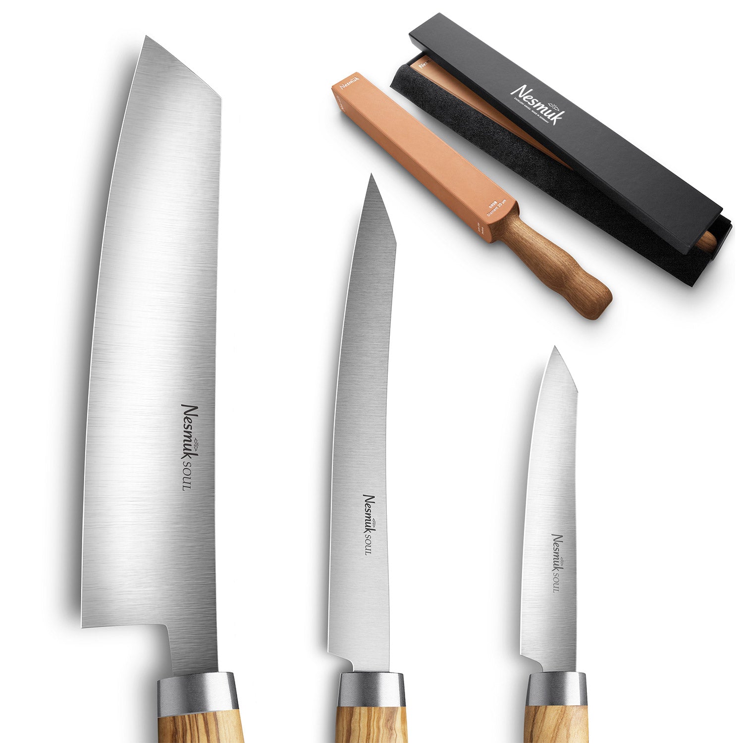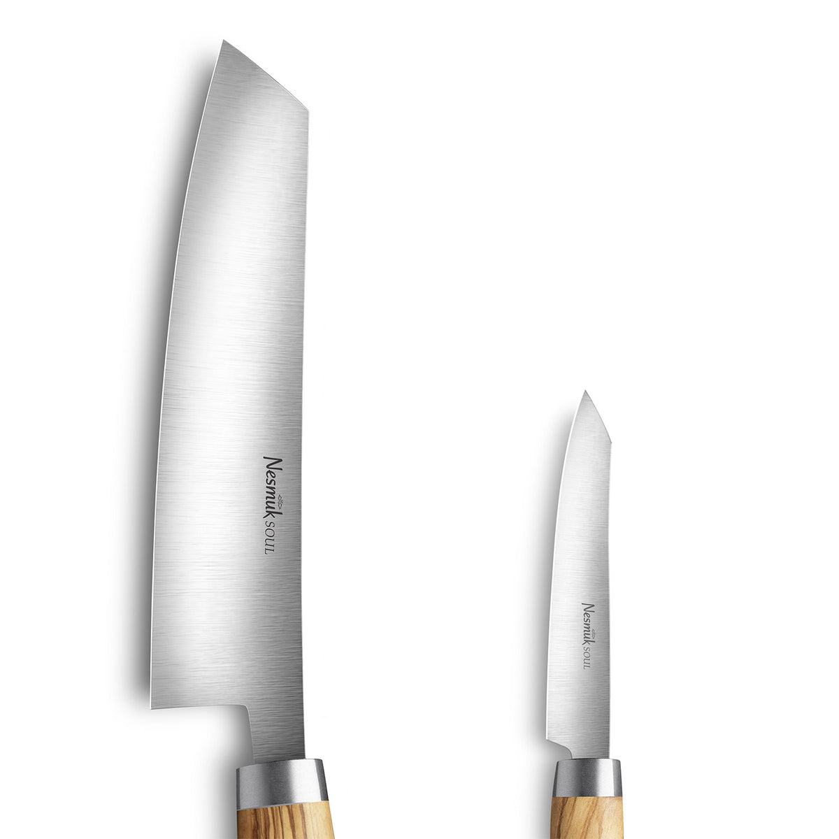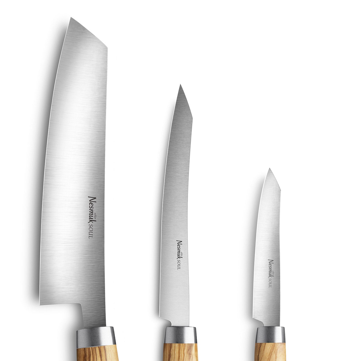 Im Klingendesign, in der herausragenden Schneidleistung, in der Ausgewogenheit zwischen Schärfe und Standzeit, spiegelt sich die „Seele“ dieses Messertyps optimal wider. Die Besonderheit der Kollektion SOUL ist die einzigartige Legierung des Klingenstahls: Der patentierte Nesmuk Stahl enthält das seltene Element Niob – dieses sorgt für das feinst-mögliche Stahlgefüge trotz Rostträgheit. Gleichzeitig wird eine höhere mechanische Festigkeit erreicht, die Klinge wird fester und zäher. Die geprüfte Stahlhärte liegt bei 60 HRC. Das Ergebnis ist eine erhöhte Standzeit und Schnitthaltigkeit. Zwar wird die Verarbeitung des Stahls durch dessen Zähigkeit erschwert, aber durch die Kombination des feinen Stahlgefüges, der ungewöhnlich dünn geschliffenen Klingen und der handwerklichen Präzision der Manufaktur wird die extreme Schärfe erreicht, die Nesmuk von herkömmlichen Messern unterscheidet.