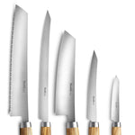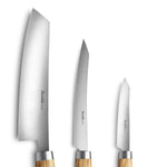 Olivenholz zählt zweifelsohne zu den schönsten Hölzern. Nesmuk verwendet ausschließlich handverlesene Stücke wildgewachsenen Olivenholzes einer bestimmten Region in Spanien – mit besonders spektakulärer Maserung, hellbraun bis goldgelb, wild geriegelt mit dunklen Streifen. Die Griffe werden bewusst nicht poliert, um die angenehm weiche Haptik des Olivenholzes zu erhalten.