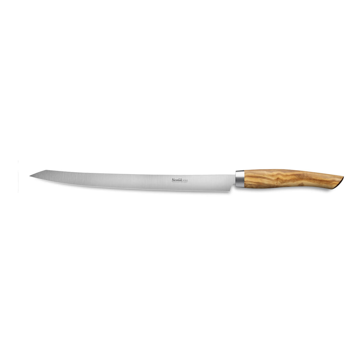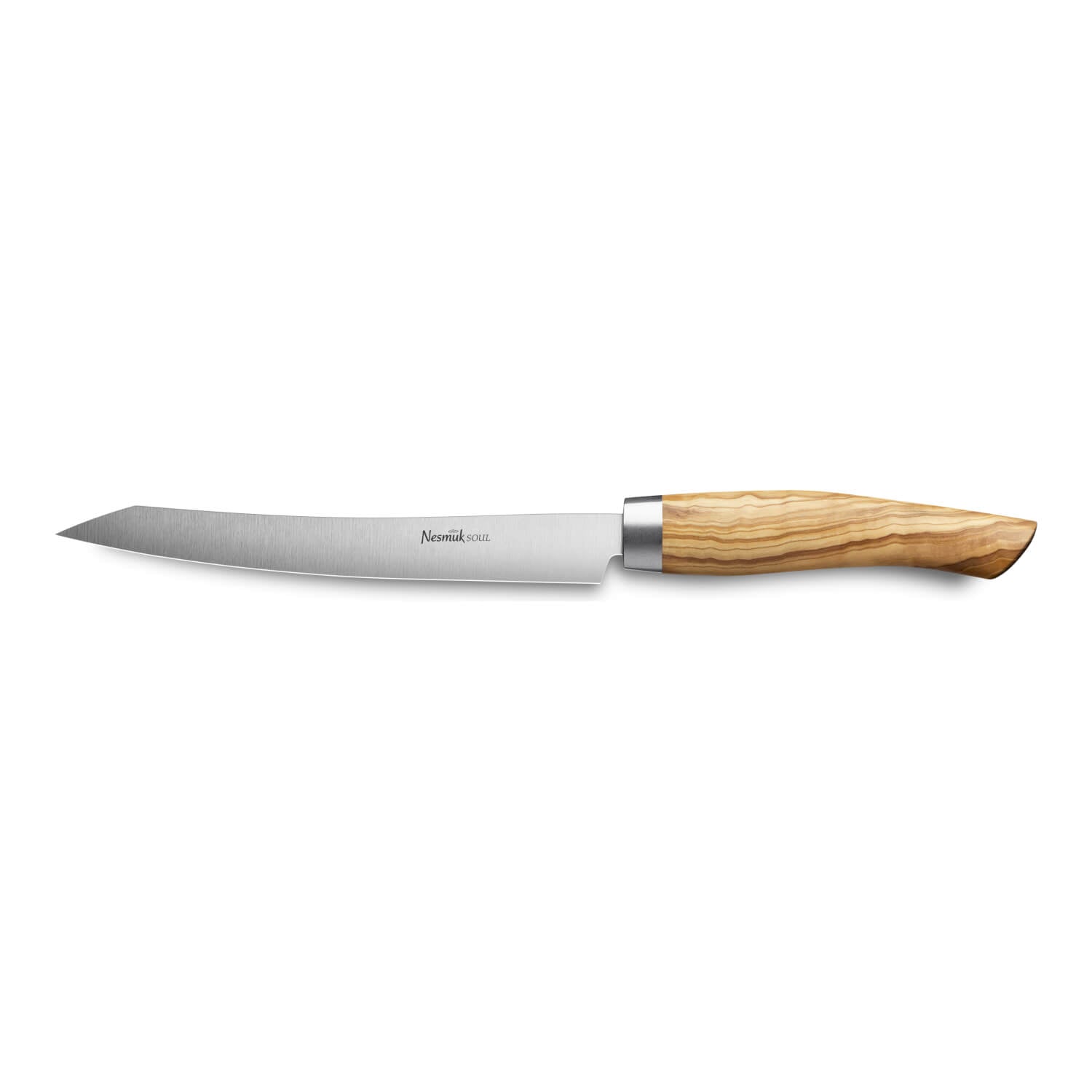 Das Nesmuk SOUL Kochmesser war das erste Messer, das aus einem gänzlich anderen Stahl als in der Messerindustrie üblich gefertigt wurde. Es symbolisiert so die Idee hinter Nesmuk und markiert den Beginn eines neuen Anspruchs an das wichtigste Küchenwerkzeug überhaupt. Nesmuk SOUL Kochmesser 180 mm Griff Olivenholz ermöglicht Dank des in der einzigartigen Stahllegierung enthaltenen Elements Niob eine extreme Schärfe und hervorragende Schneidhaltigkeit, die mit gewöhnlichen Edelstahlsorten nicht zu erreichen ist. Das Kochmesser mit einer 180 mm langen und 3 mm starken, einseitig hohlgeschliffenen Klinge ist der klassische Allrounder und als „Basis-Messer“ in jeder Küche unverzichtbar und vielseitig einsetzbar.